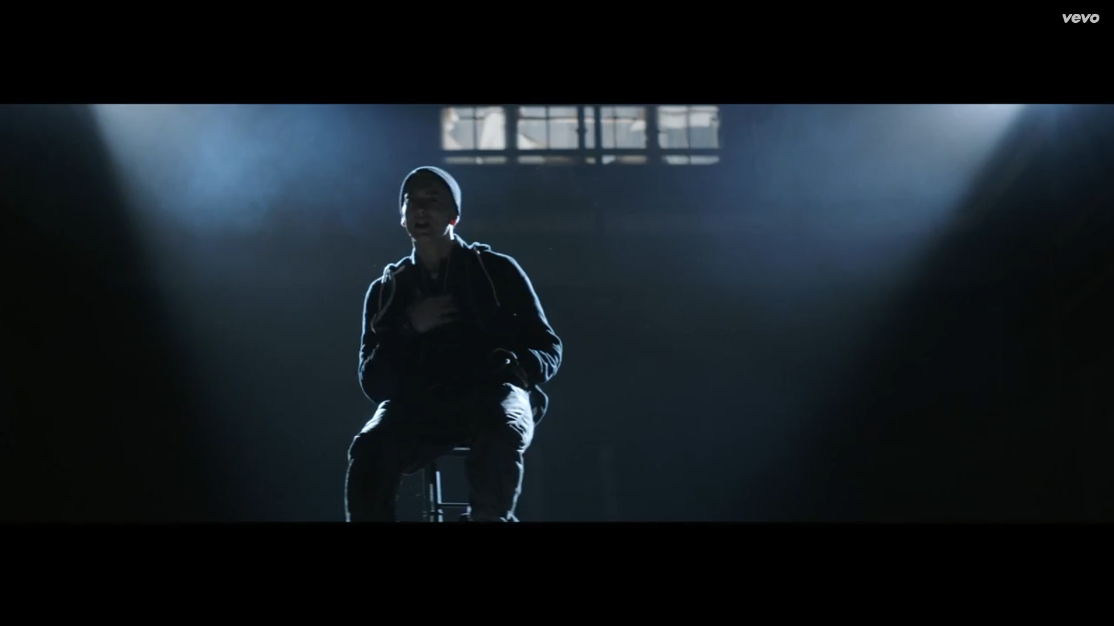 Description: A man sitting on a stool in a dark room with lights on the floor and a window behind him.