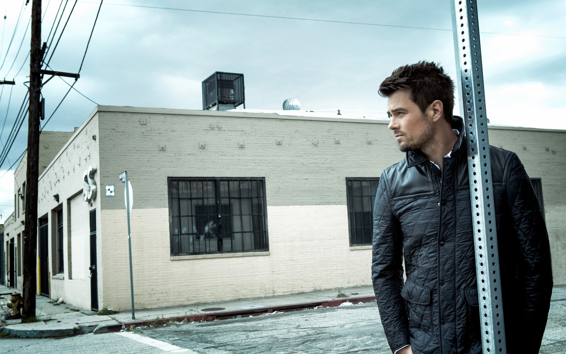 Description: A man standing next to a street sign in front of a building with a clock tower on top of it.