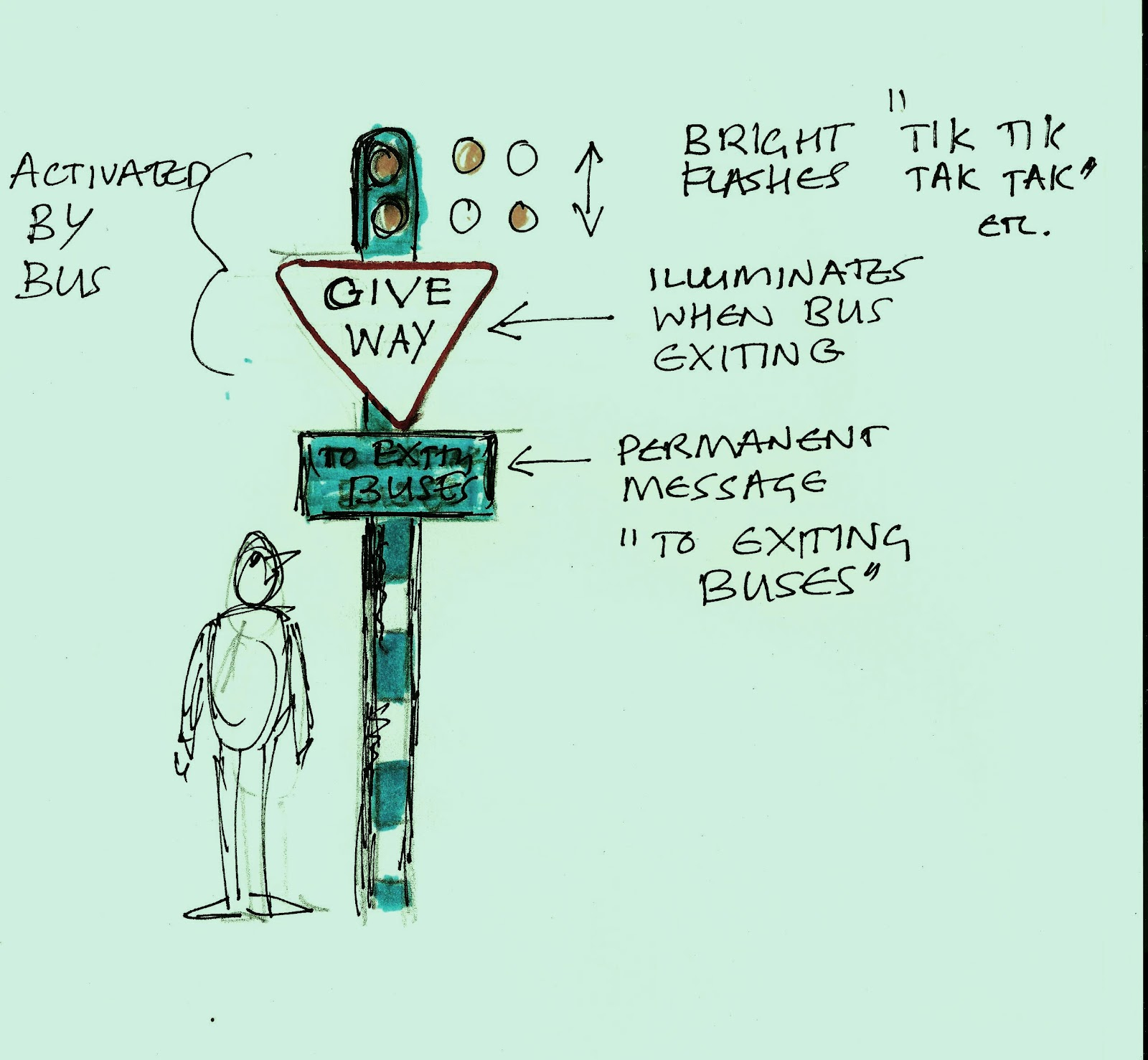 Description: A drawing of a man standing next to a street sign with words written on it and a traffic light.