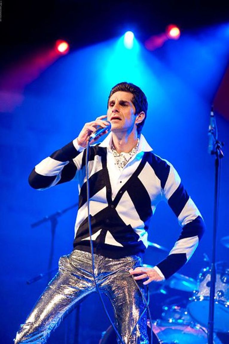 Description: A man in a striped sweater singing into a microphone on stage with a microphone in his hand and a microphone in his other hand.