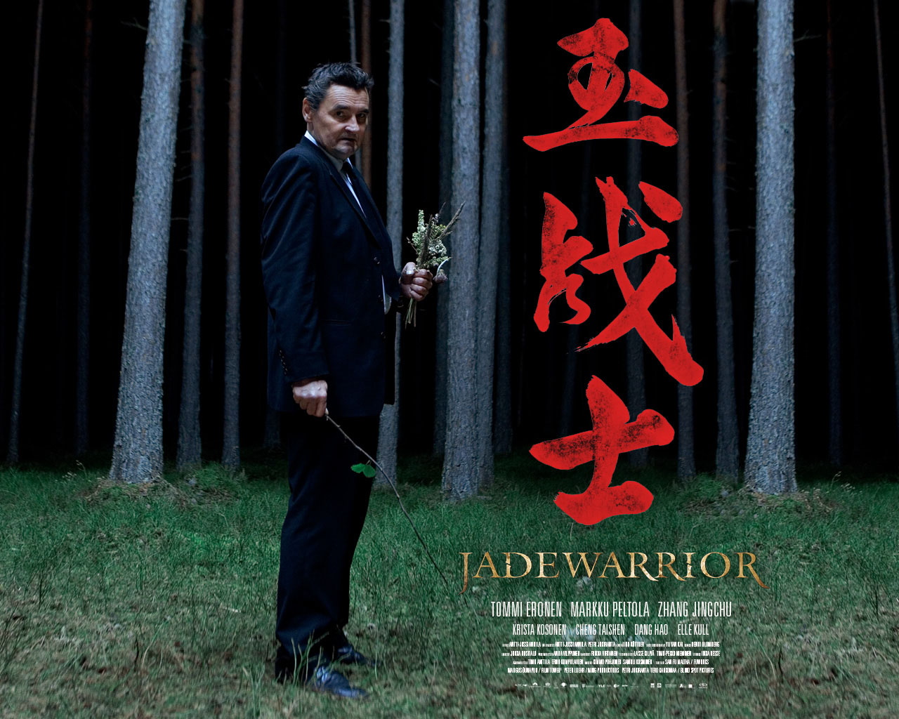 Description: A man in a suit holding a flower in front of a forest with a chinese character on it's back.