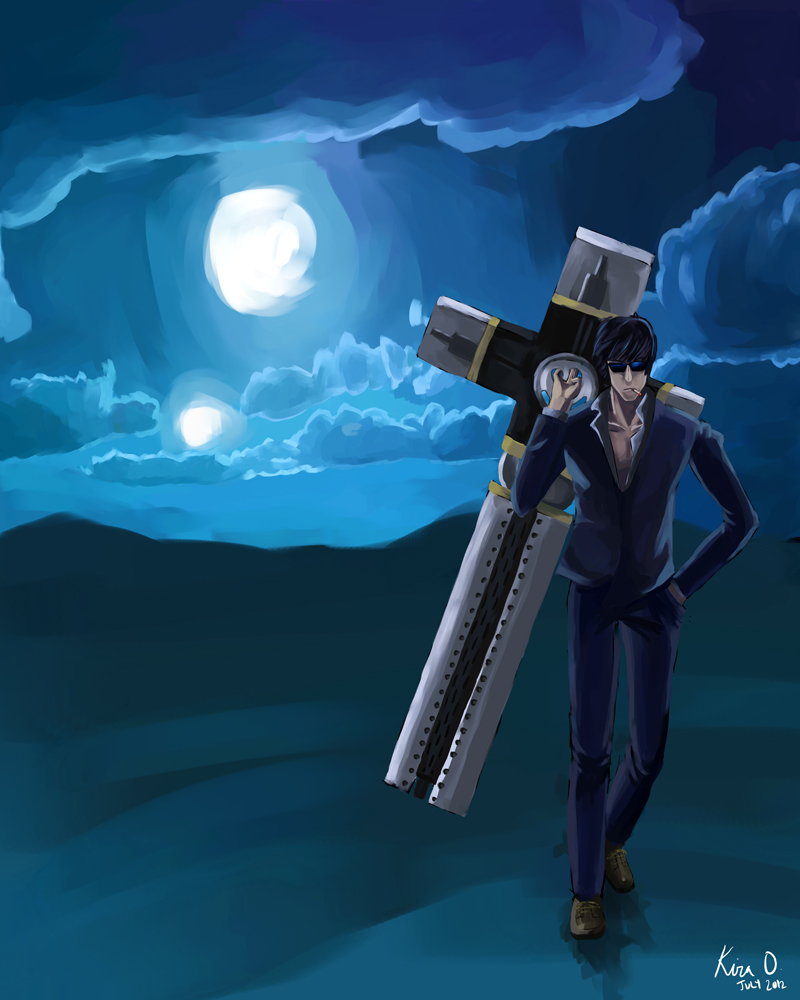 Description: A man in a suit holding a giant cross in the sky with a full moon in the background and clouds.
