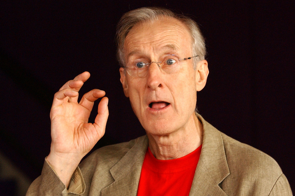 Description: A man in a suit and glasses making a gesture with his hand and a red shirt on his chest.
