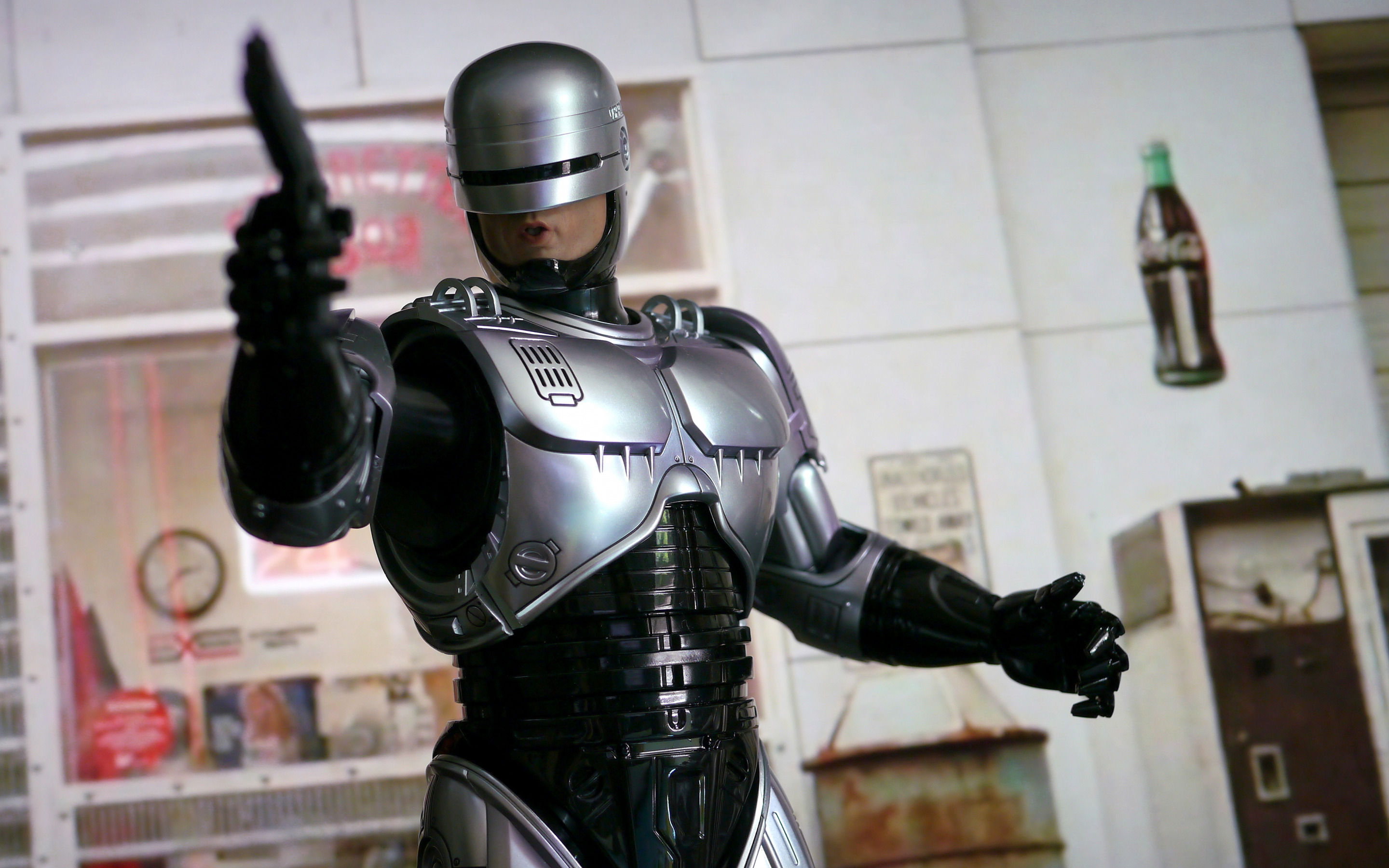 Description: A man in a suit holding a gun in a room with a wall and a sign on it that says.