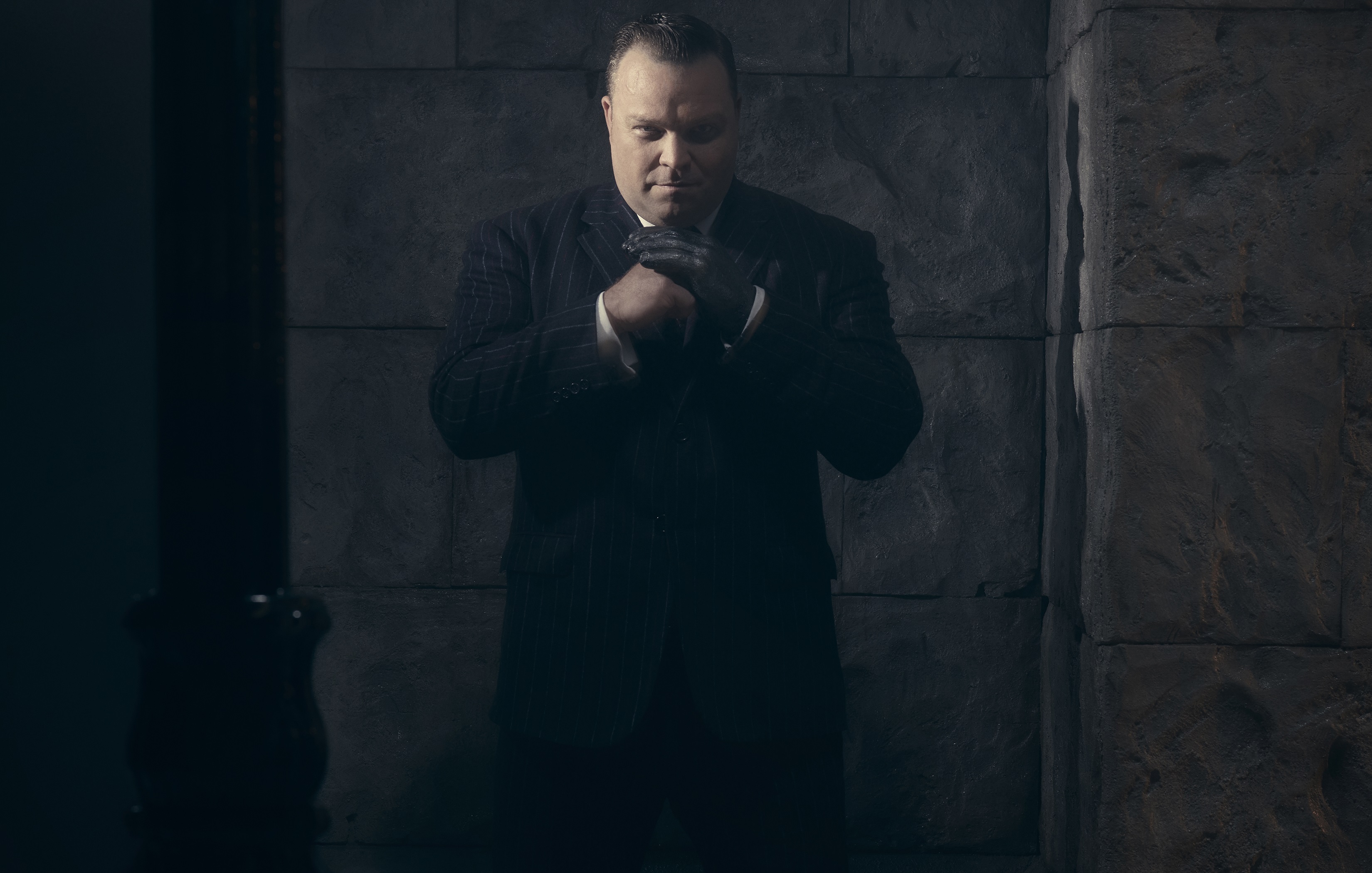 Description: A man in a suit is holding a gun in his hand and looking at the camera with a serious look on his face.