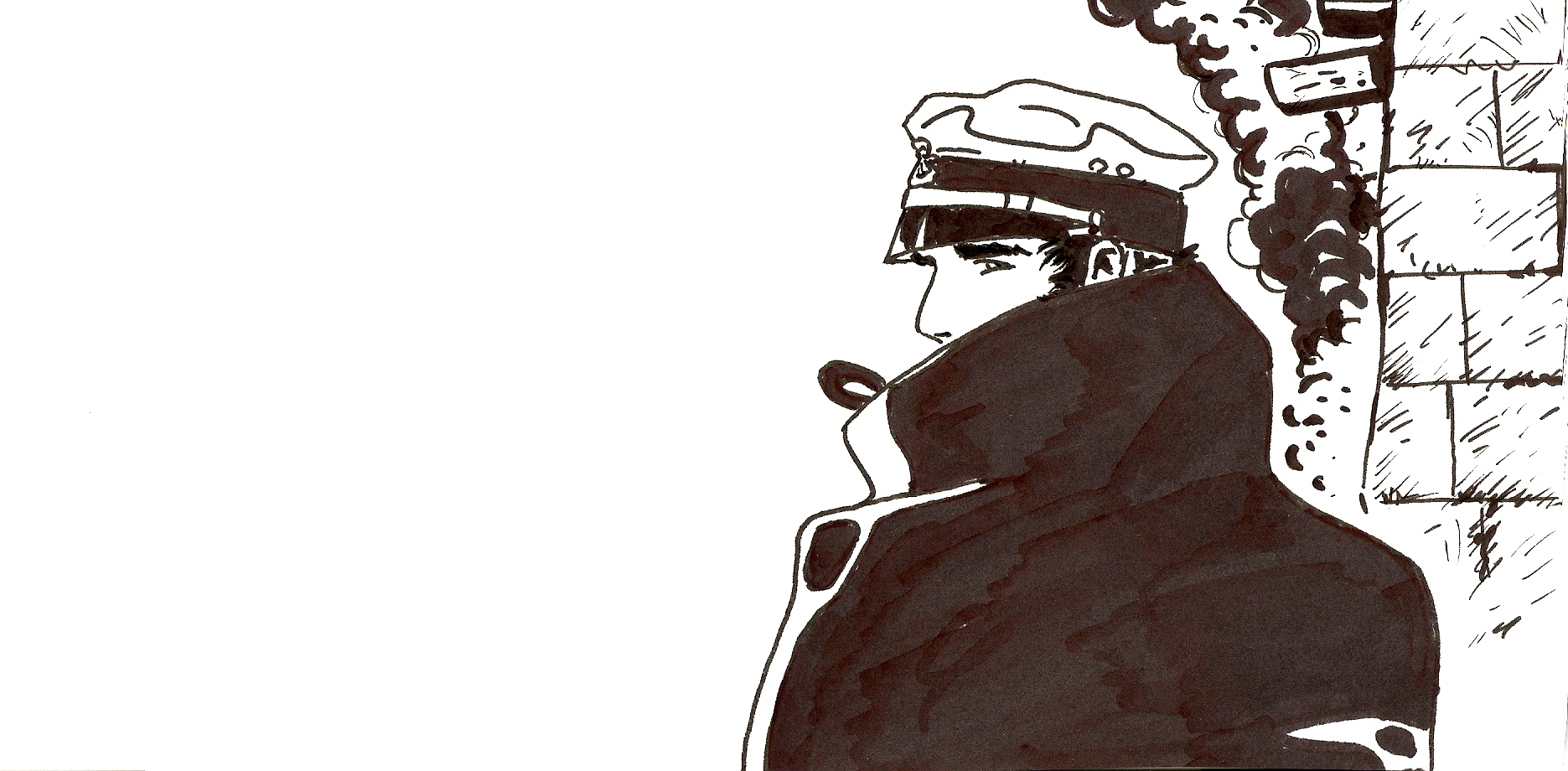 Description: A drawing of a man in a suit and hat talking on a cell phone while standing next to a brick wall.