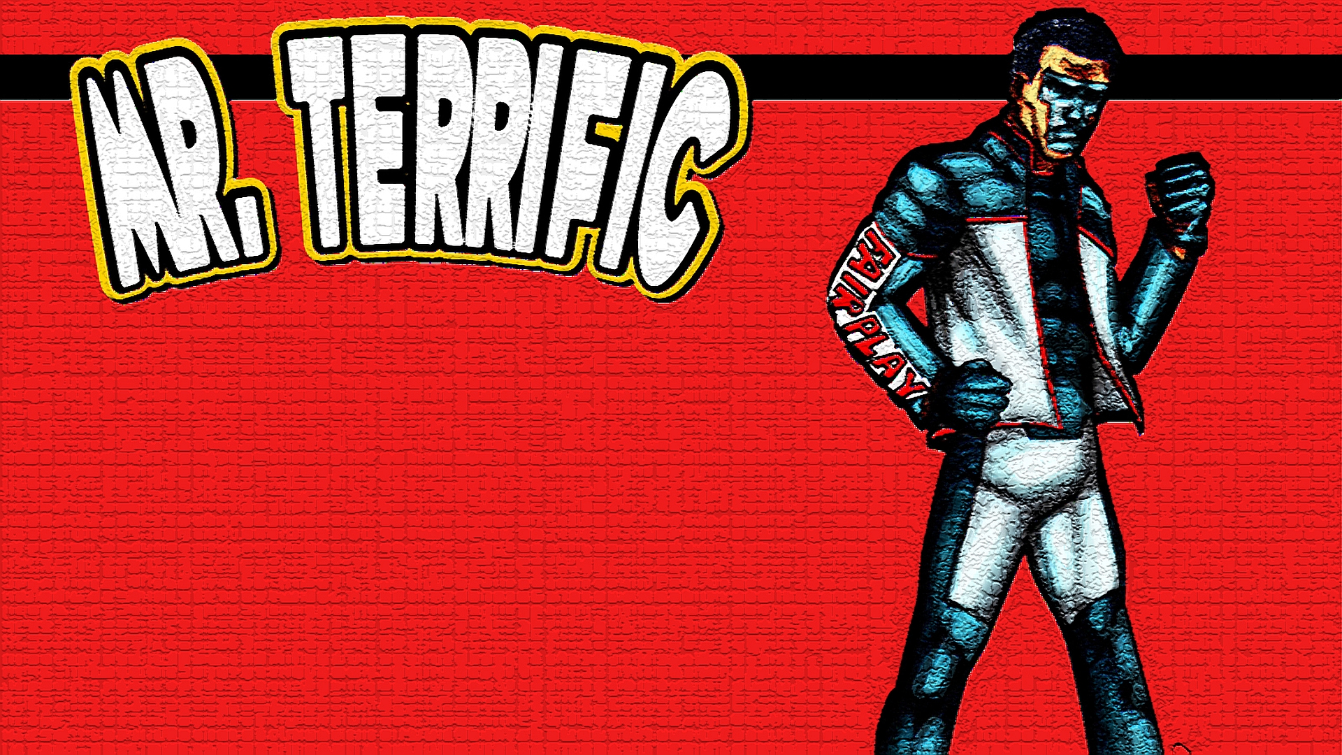 Description: A man in a suit with a helmet and gloves on standing in front of a red background with the words mr tennis.