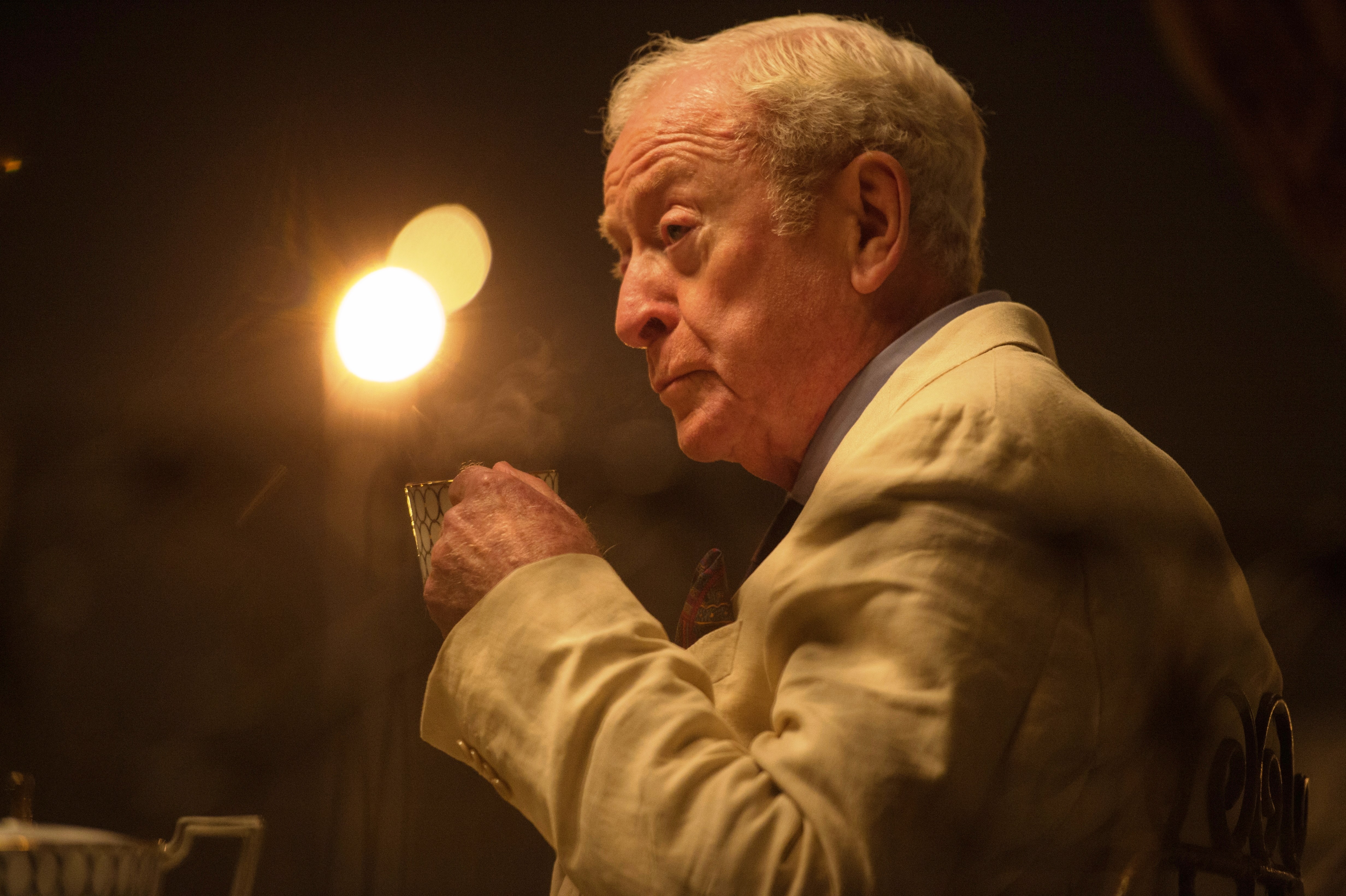 Description: A man in a suit is holding a glass of wine in his hand and a light is on behind him.