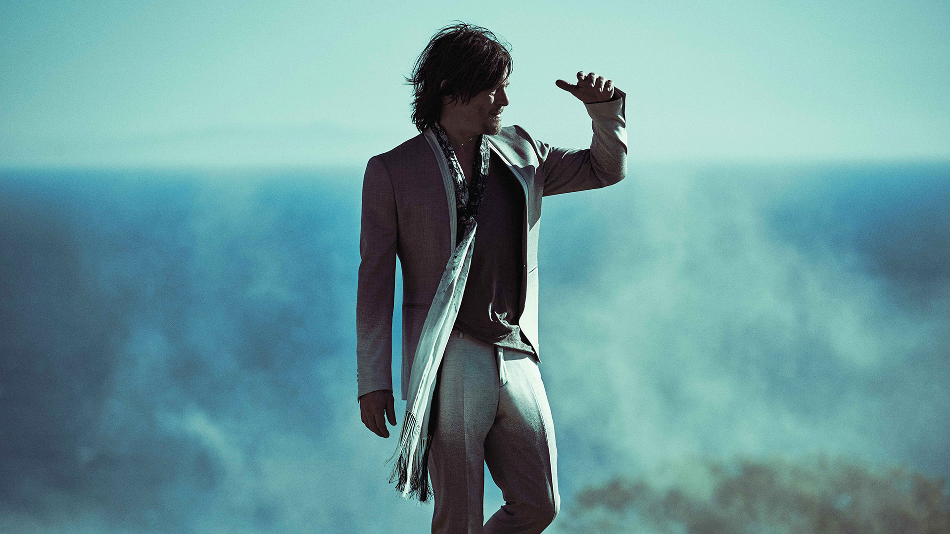 Description: A man in a suit and tie standing on a ledge with his hand up to his face and his right hand in the air.