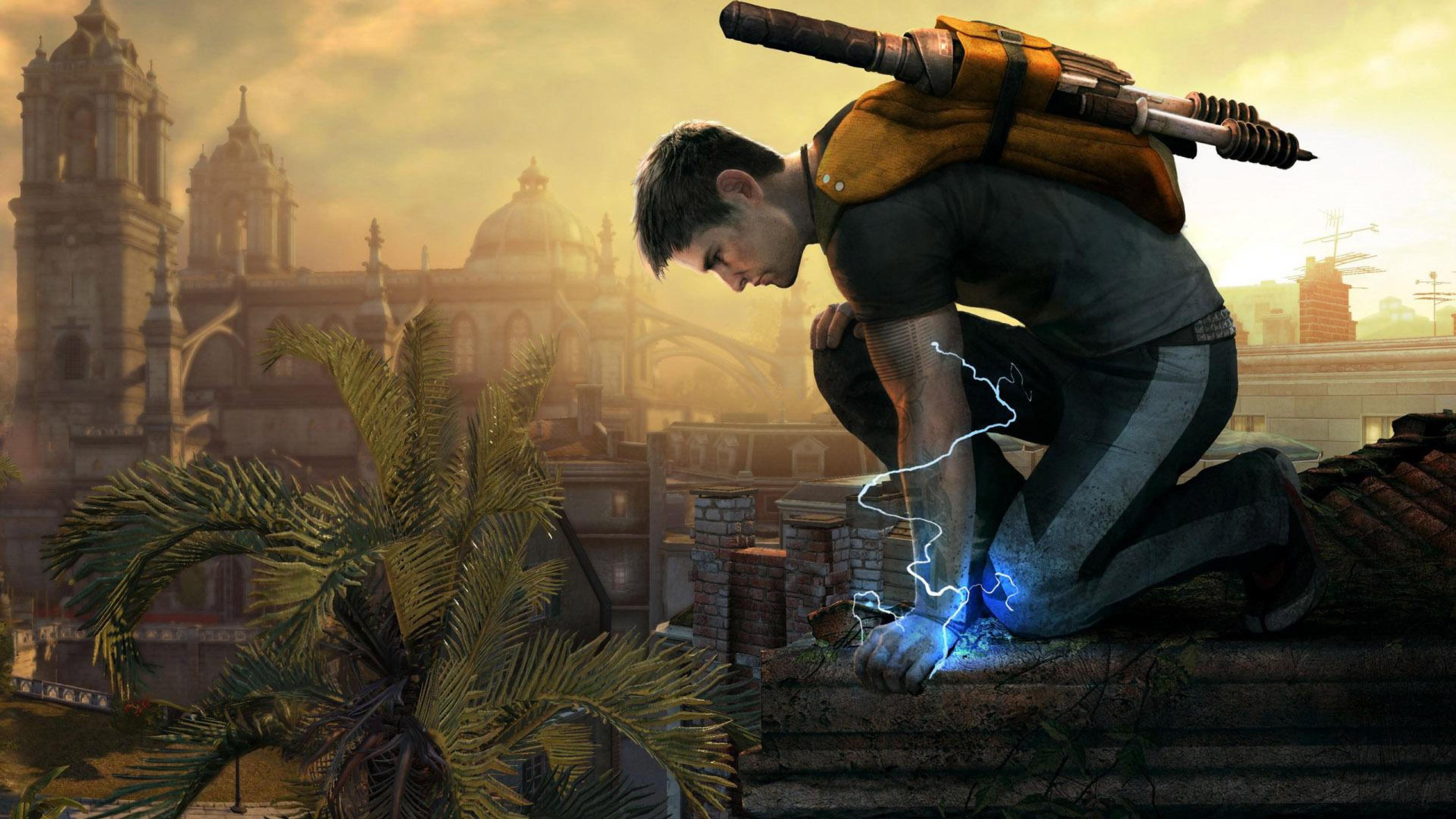 Description: A man in a suit and a lightning bolt in a screenshot of a city with a large clock tower.
