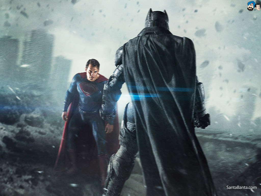 Description: A man in a suit and a man in a cape stand in front of a city skyline with a lightning bolt.