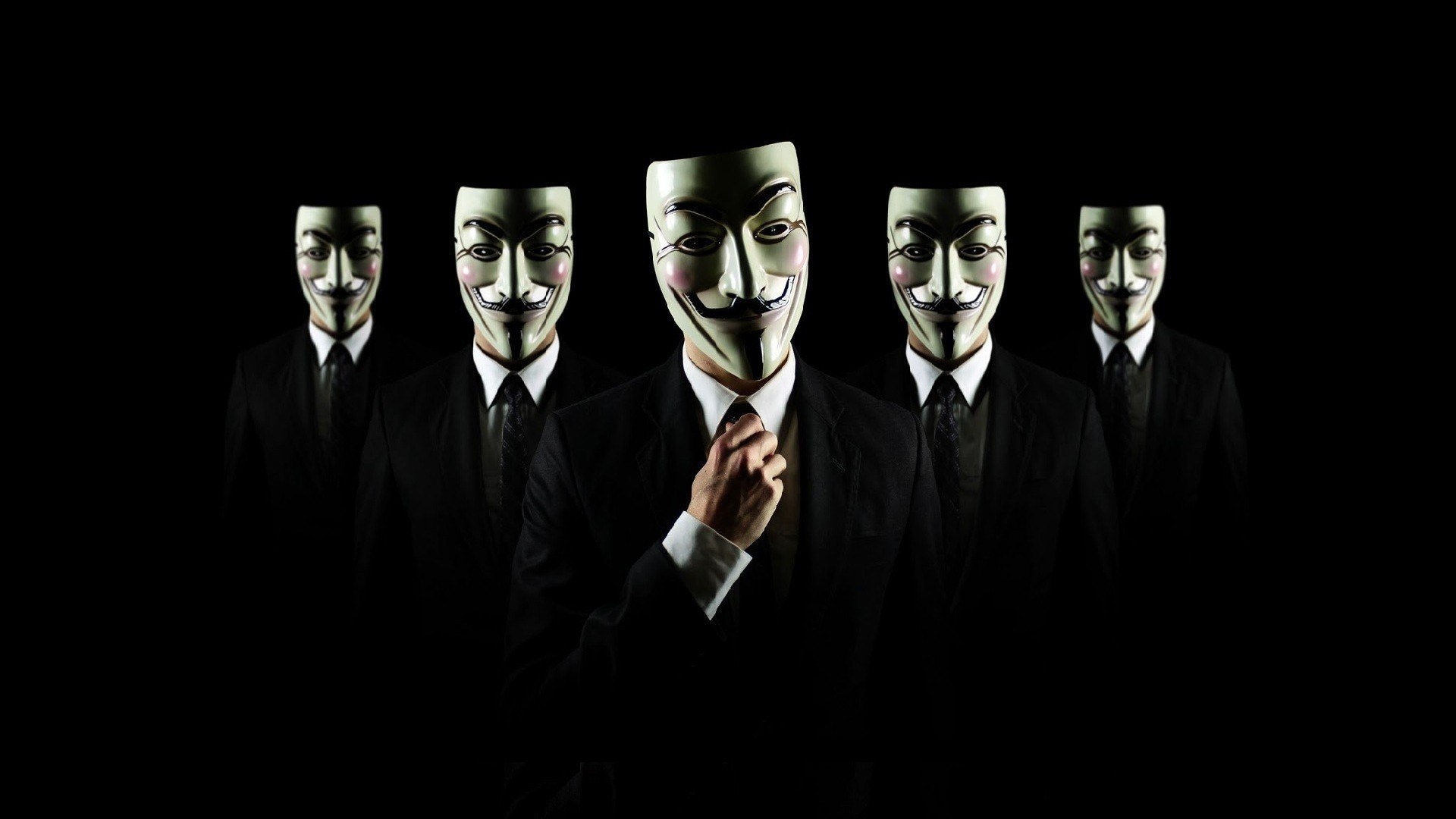 Description: A man in a suit and a group of masks with faces painted on them.