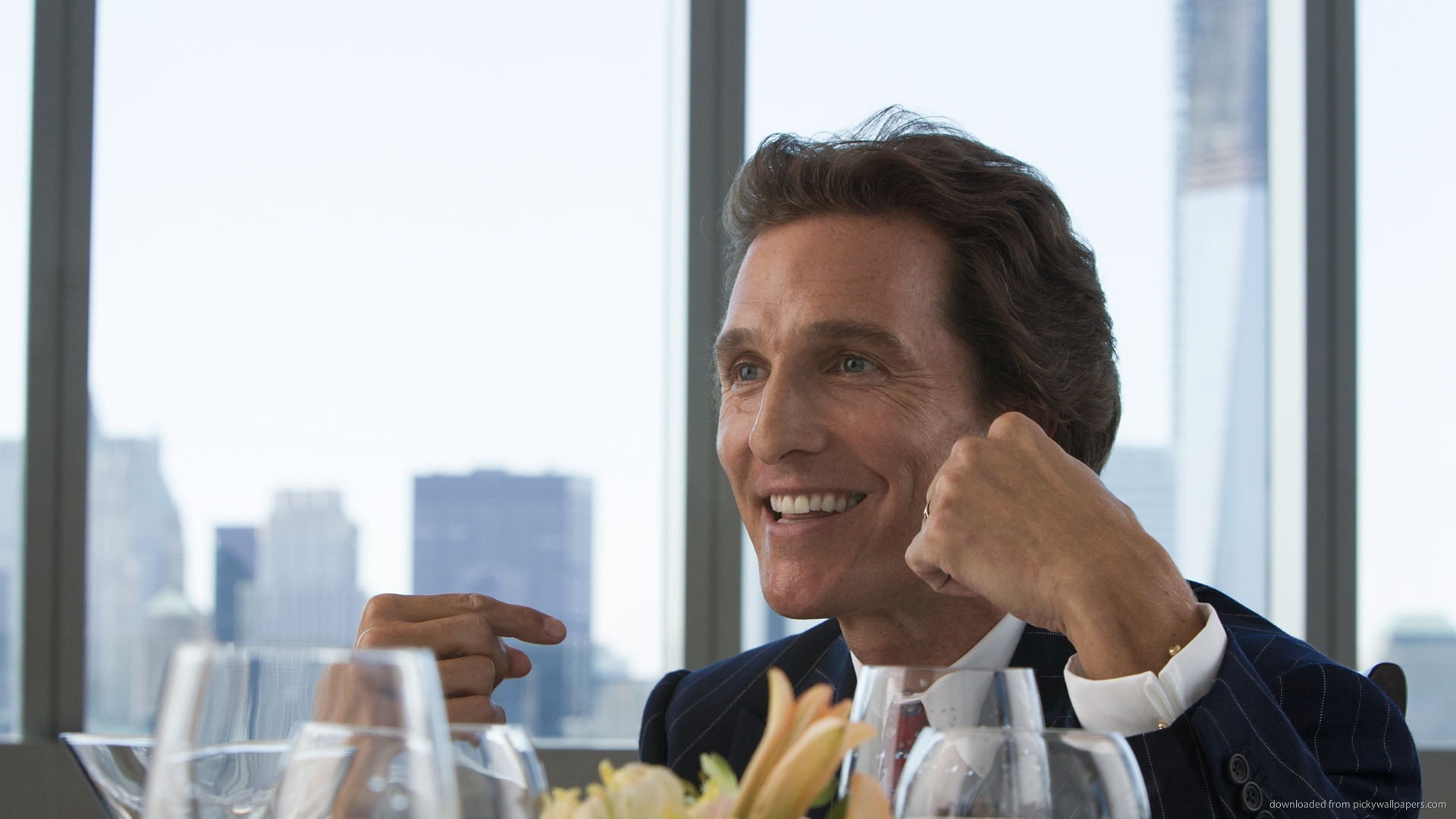 Description: A man in a suit pointing at something in front of him at a table with wine glasses and a plate of food.