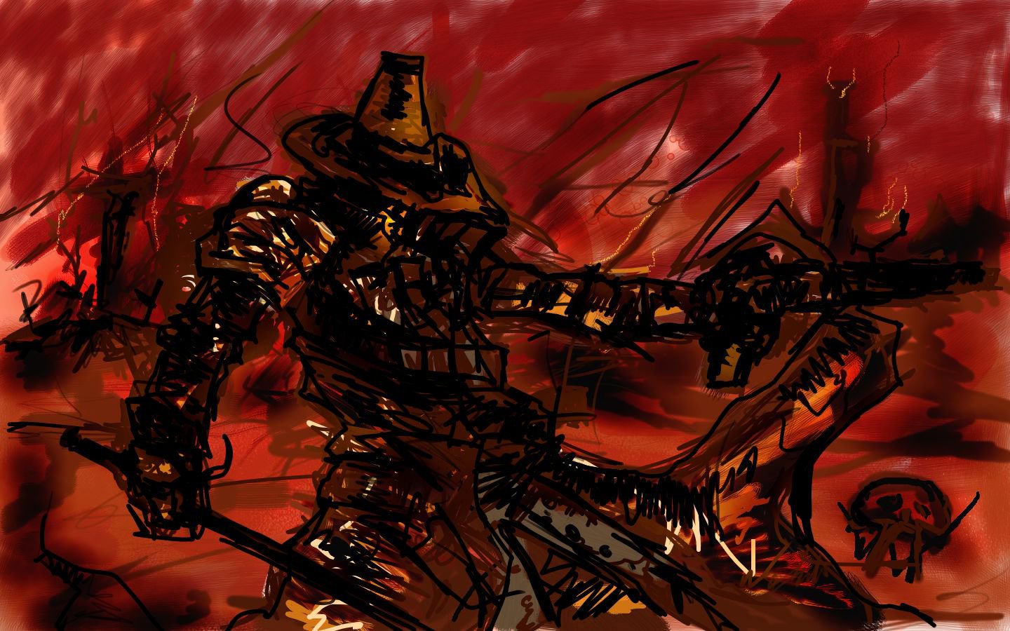 Description: A drawing of a man in a suit with a sword in his hand and a red background behind him.