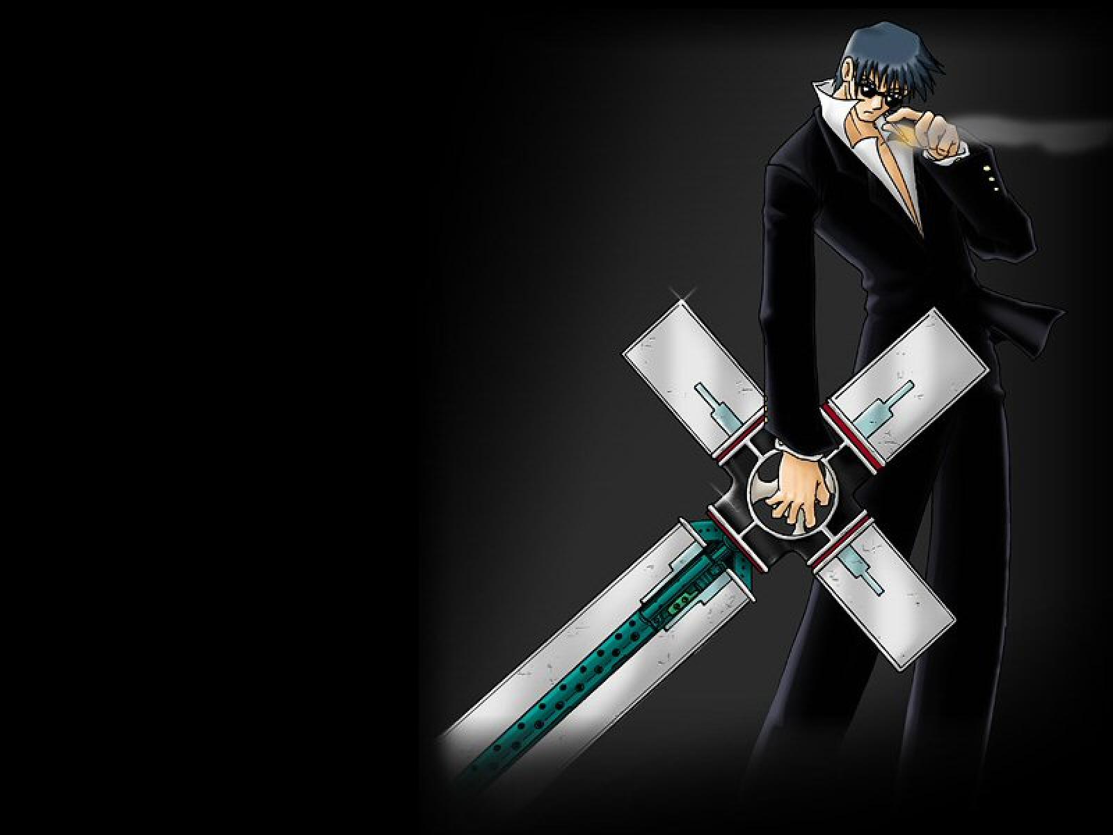 Description: A man in a suit holding two swords in his hands and a cigarette in his mouth.