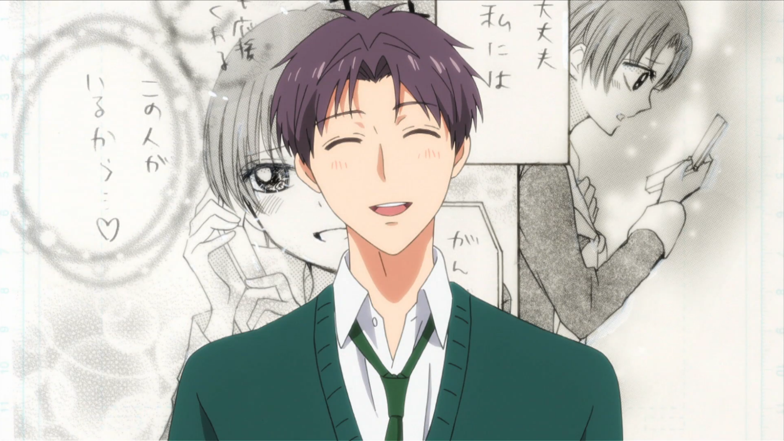 Description: A man in a suit and tie standing in front of a wall with anime characters on it's walls.
