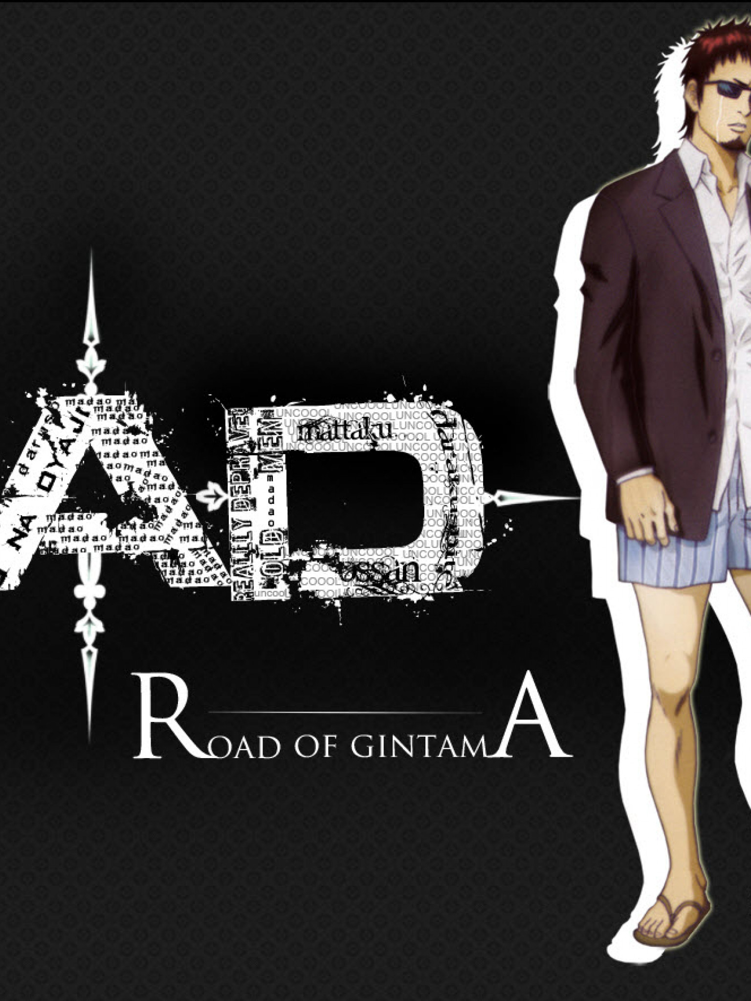 Description: A man in a suit and tie standing next to a black background with the words road of gintama.