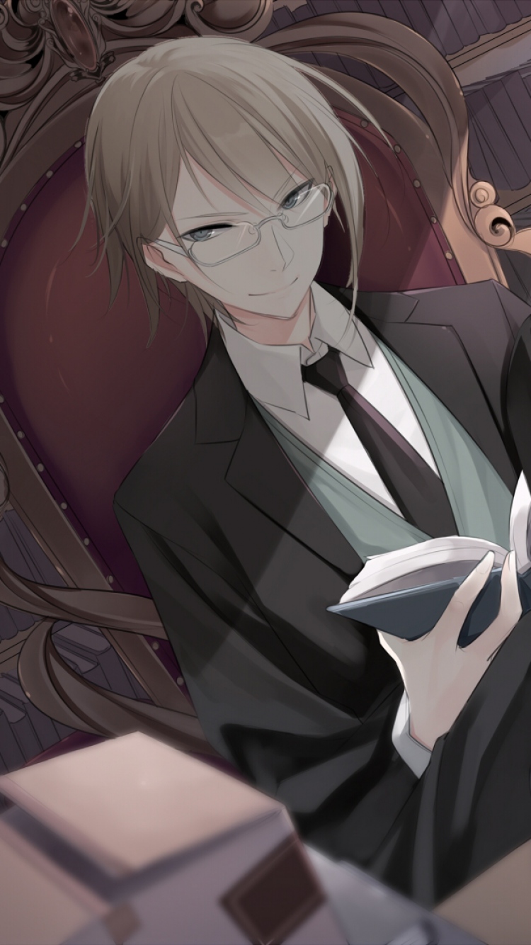 Description: A man in a suit and tie sitting in a chair with a book in his hand and a book in his other hand.