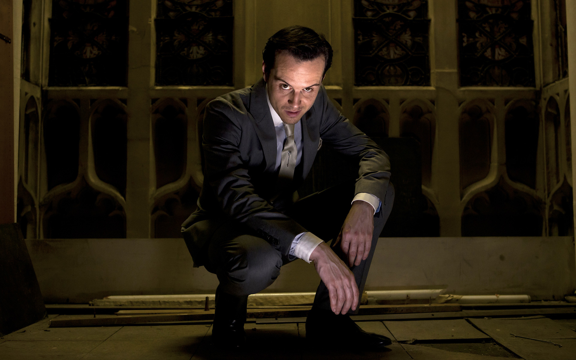 Description: A man in a suit and tie crouching down in front of a window with a clock on it.