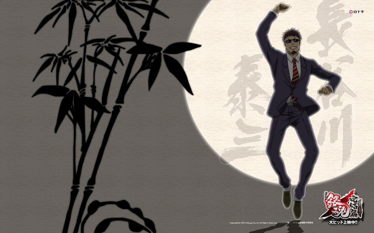 Description: A man in a suit and tie is dancing in front of a full moon with bamboo trees and asian characters.