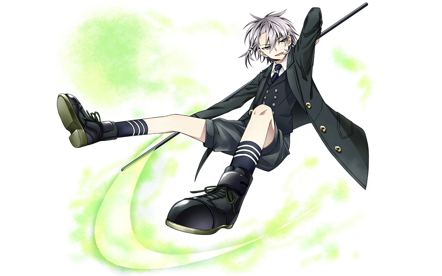 Description: A man in a suit and tie flying through the air with a broom in his hand and a green background.
