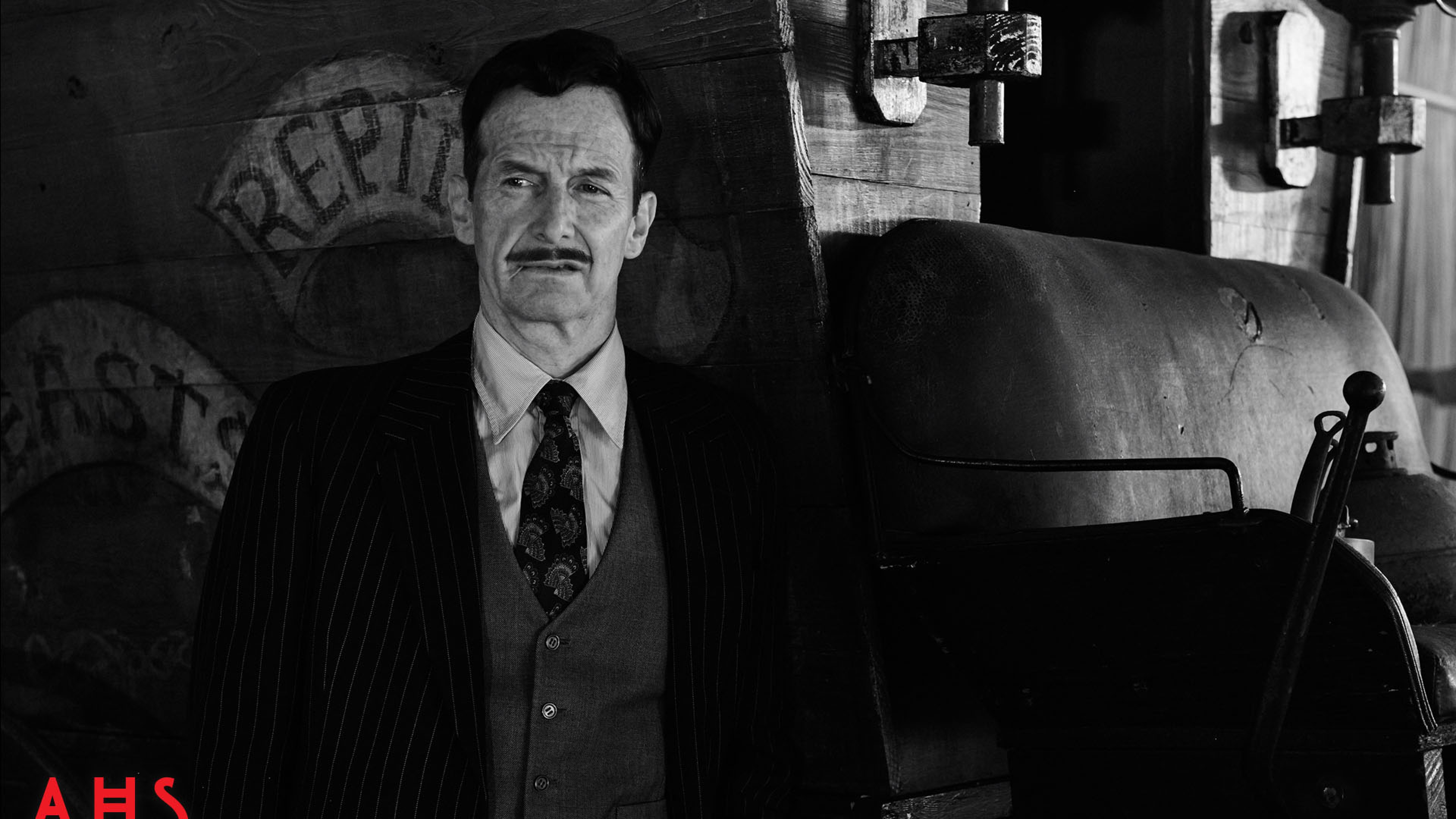 Description: A man in a suit and tie standing next to a wall with graffiti on it and a sign that says ah's.