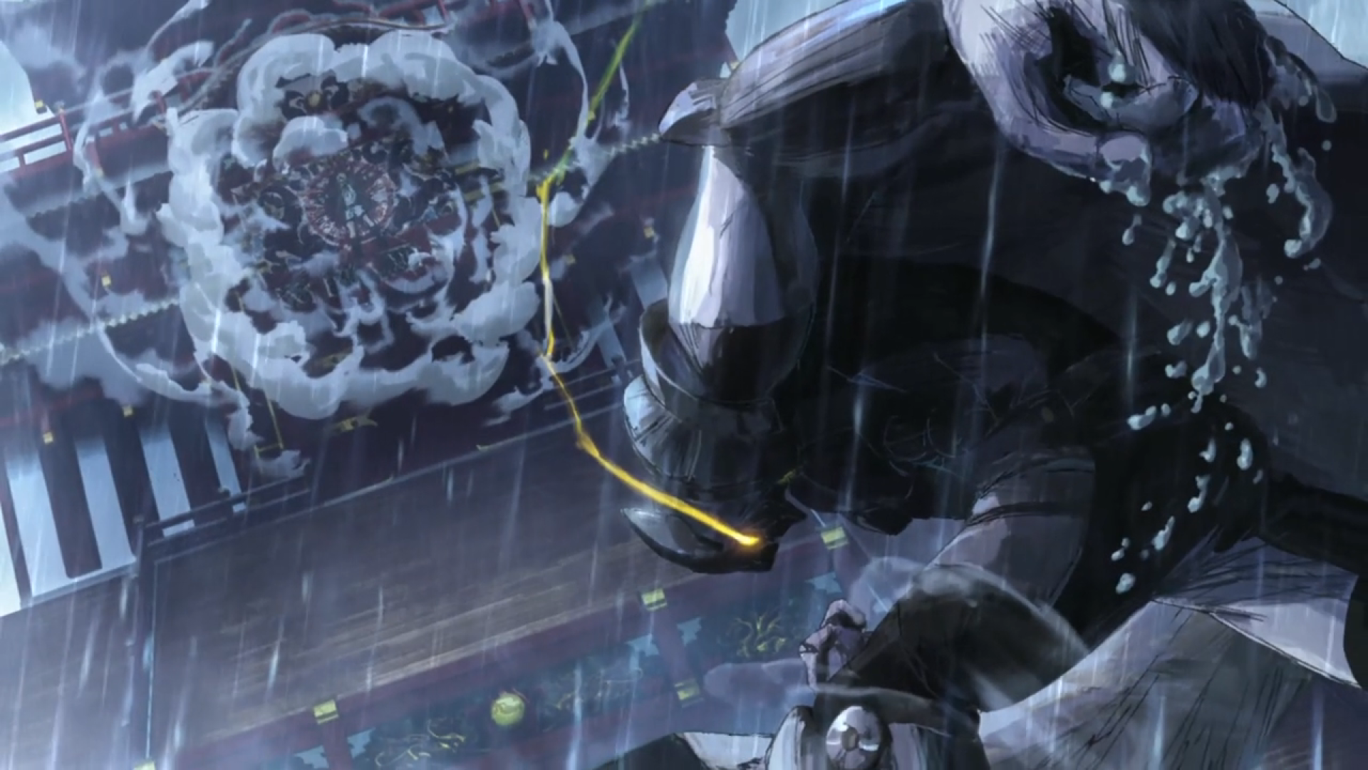 Description: A man in a suit and tie holding a gun in the rain with a clock in the background and a building in the background.