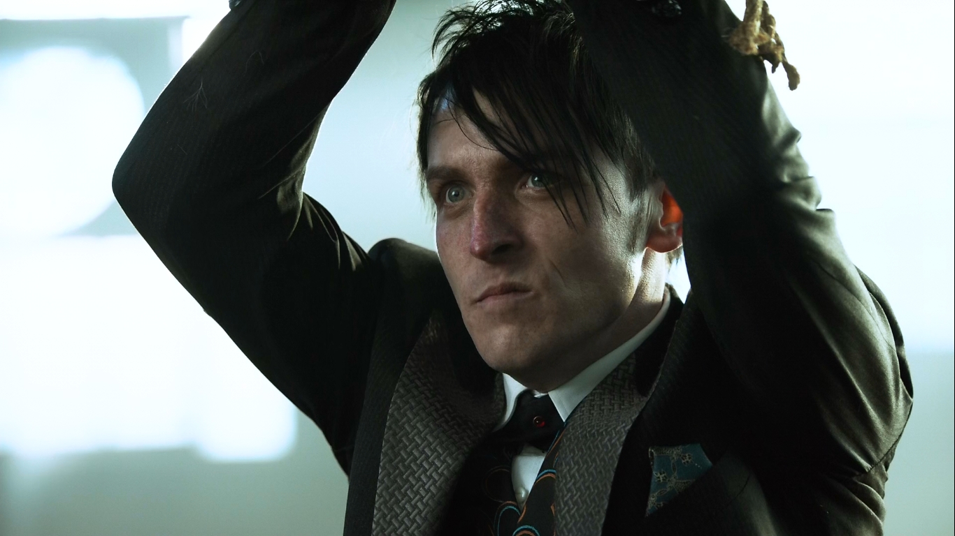 Description: A man in a suit and tie holding his head up to his head with his hands on his head.