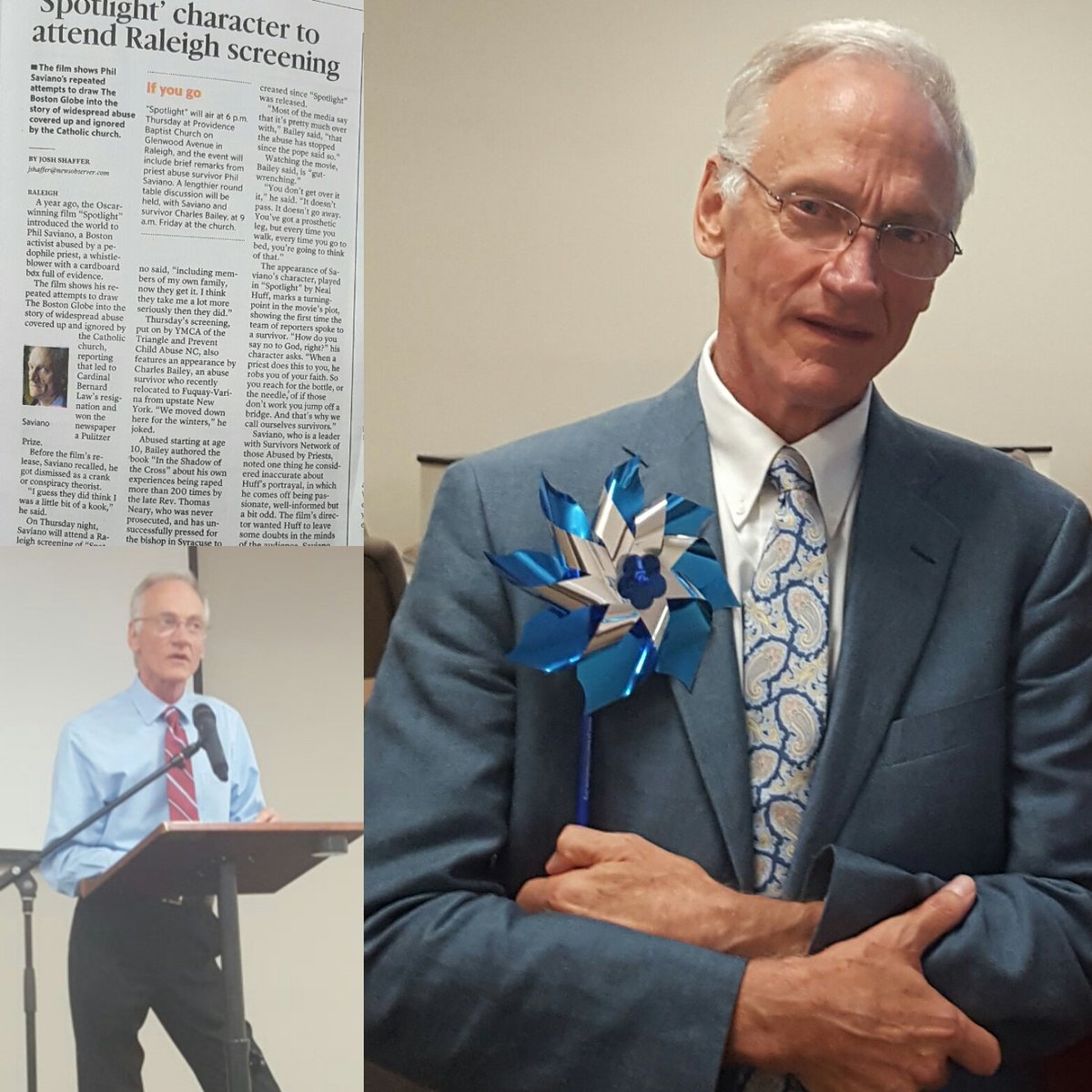 Description: A man in a suit and tie standing next to a microphone and a photo of a man in a suit and tie.