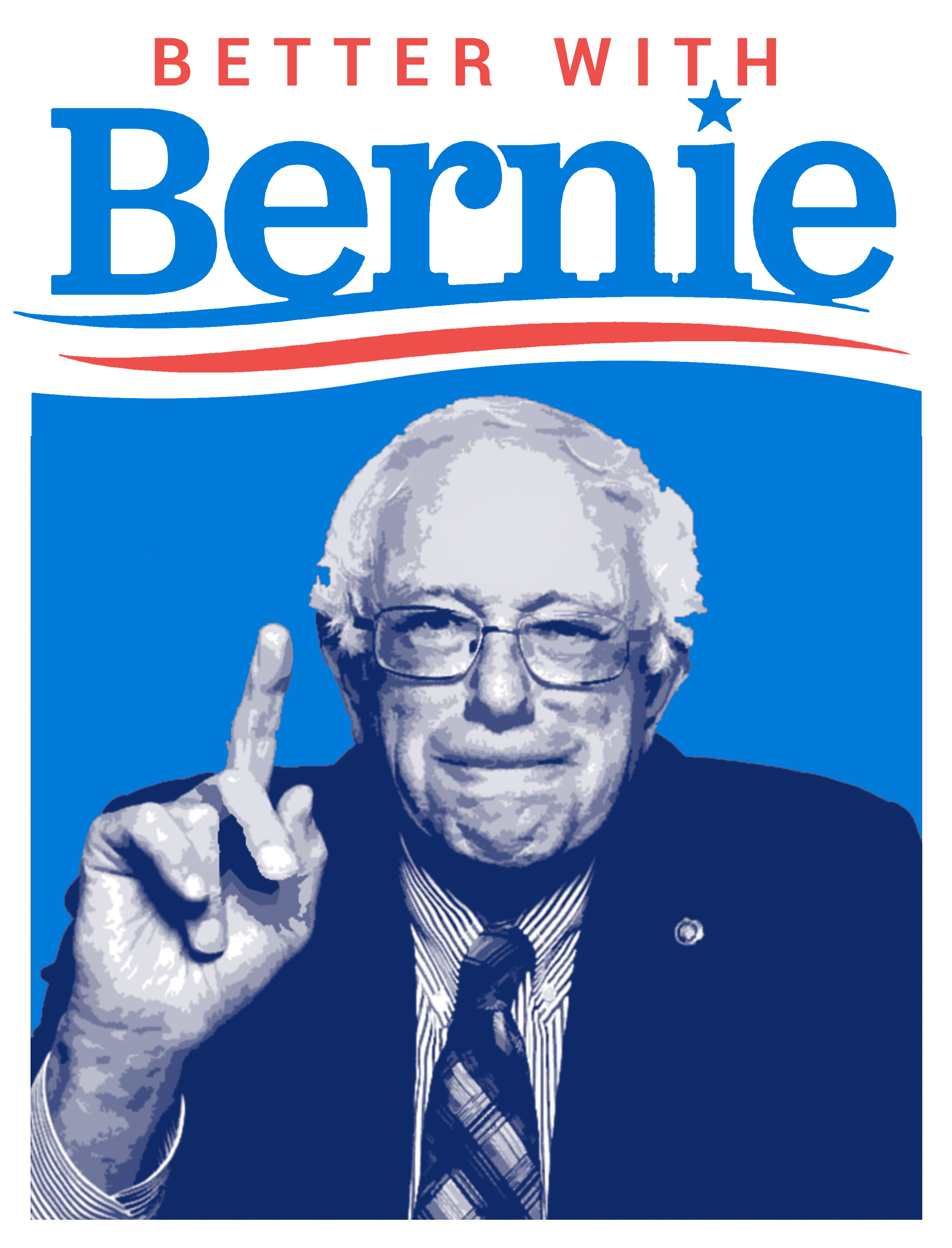 Description: A man in a suit and tie pointing at the camera with a peace sign in his hand and the words bernie on the back.