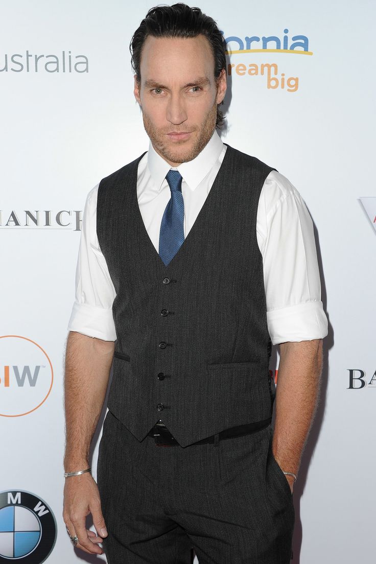 Description: A man in a suit and tie standing on a red carpet with a white shirt and black pants and a blue tie.