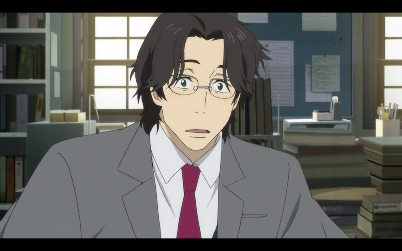 Description: A man in a suit and tie in a room with a bookcase and a window with a window.