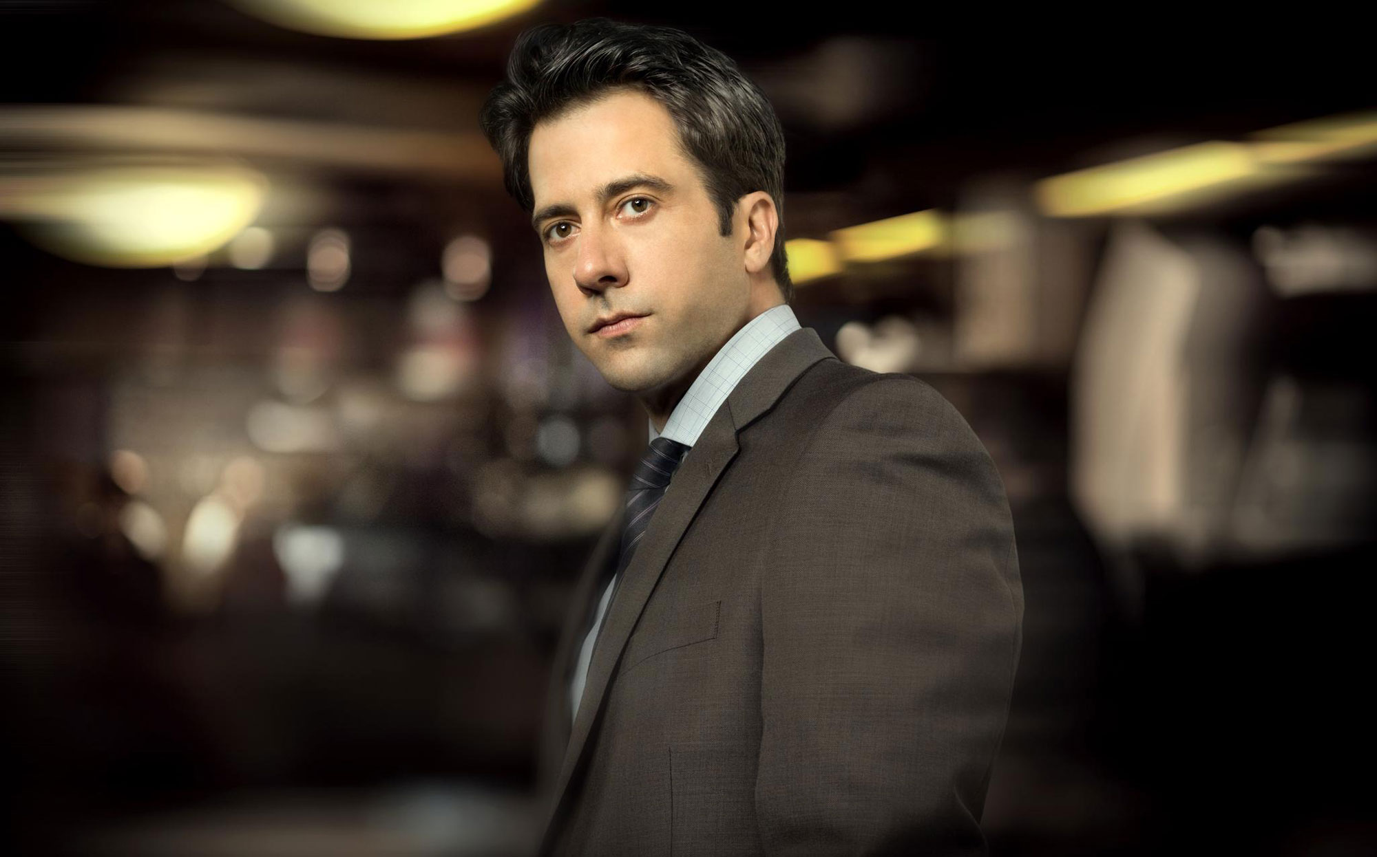 Description: A man in a suit and tie standing in a room with lights on the ceiling and a dark background.
