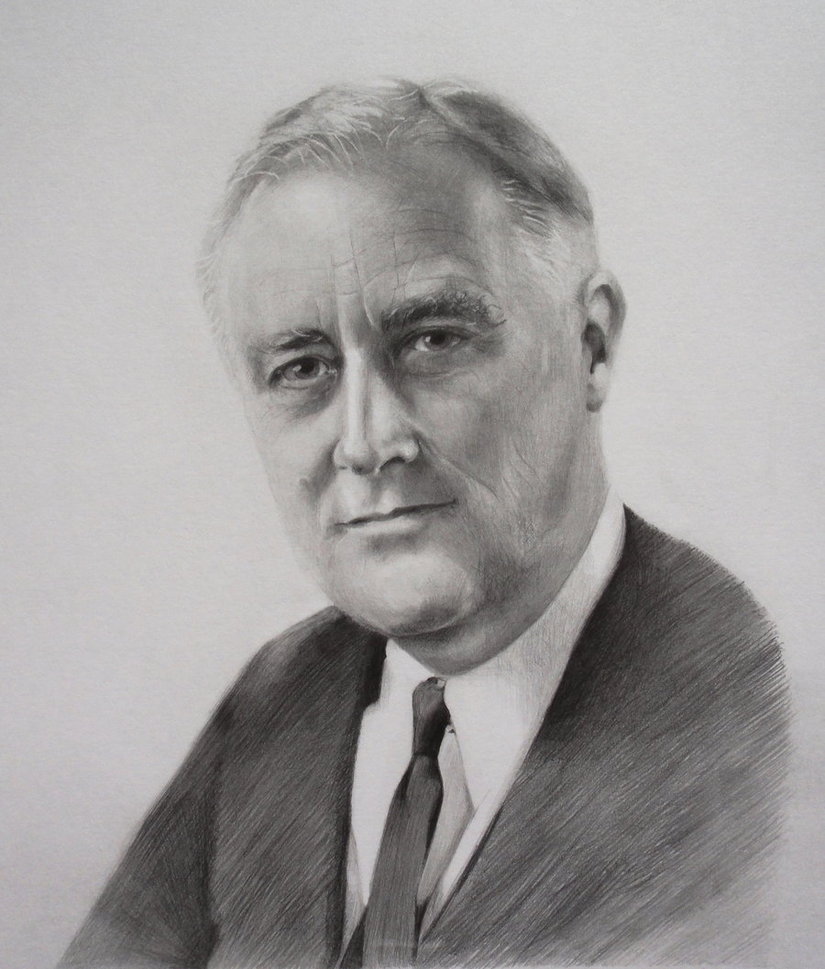 Description: A drawing of a man in a suit and tie with a serious look on his face and shoulders.
