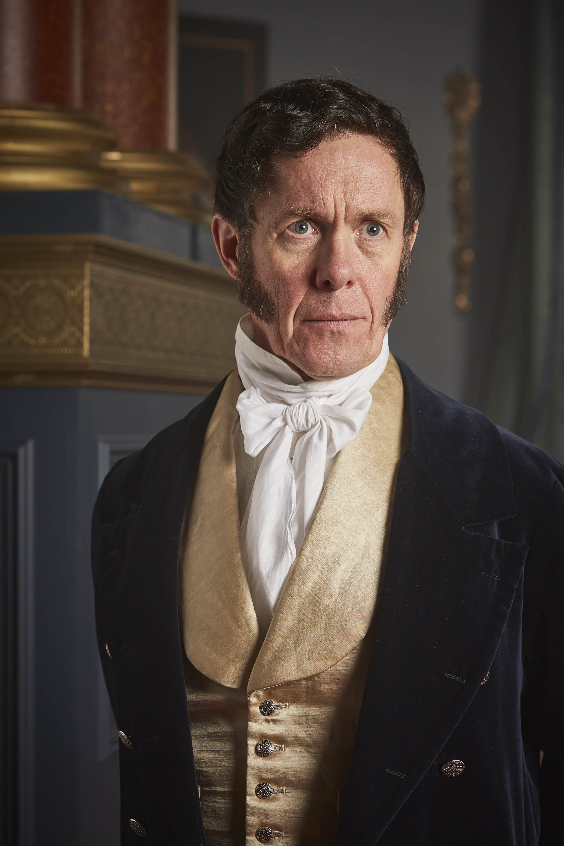 Description: A man in a suit and tie with a serious look on his face and shoulders.