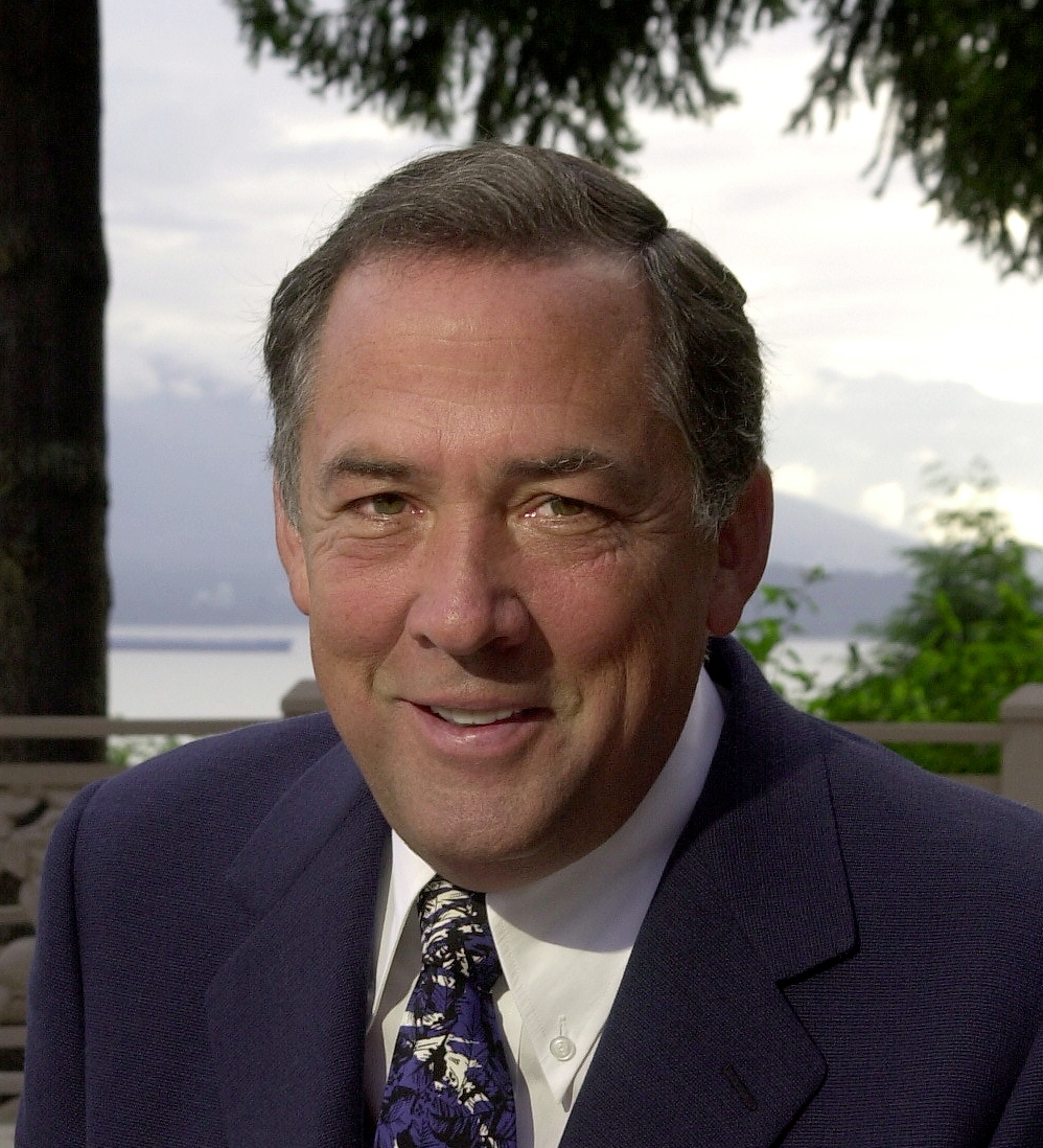 Description: A man in a suit and tie smiling for a picture in front of a tree and water with a cloudy sky.