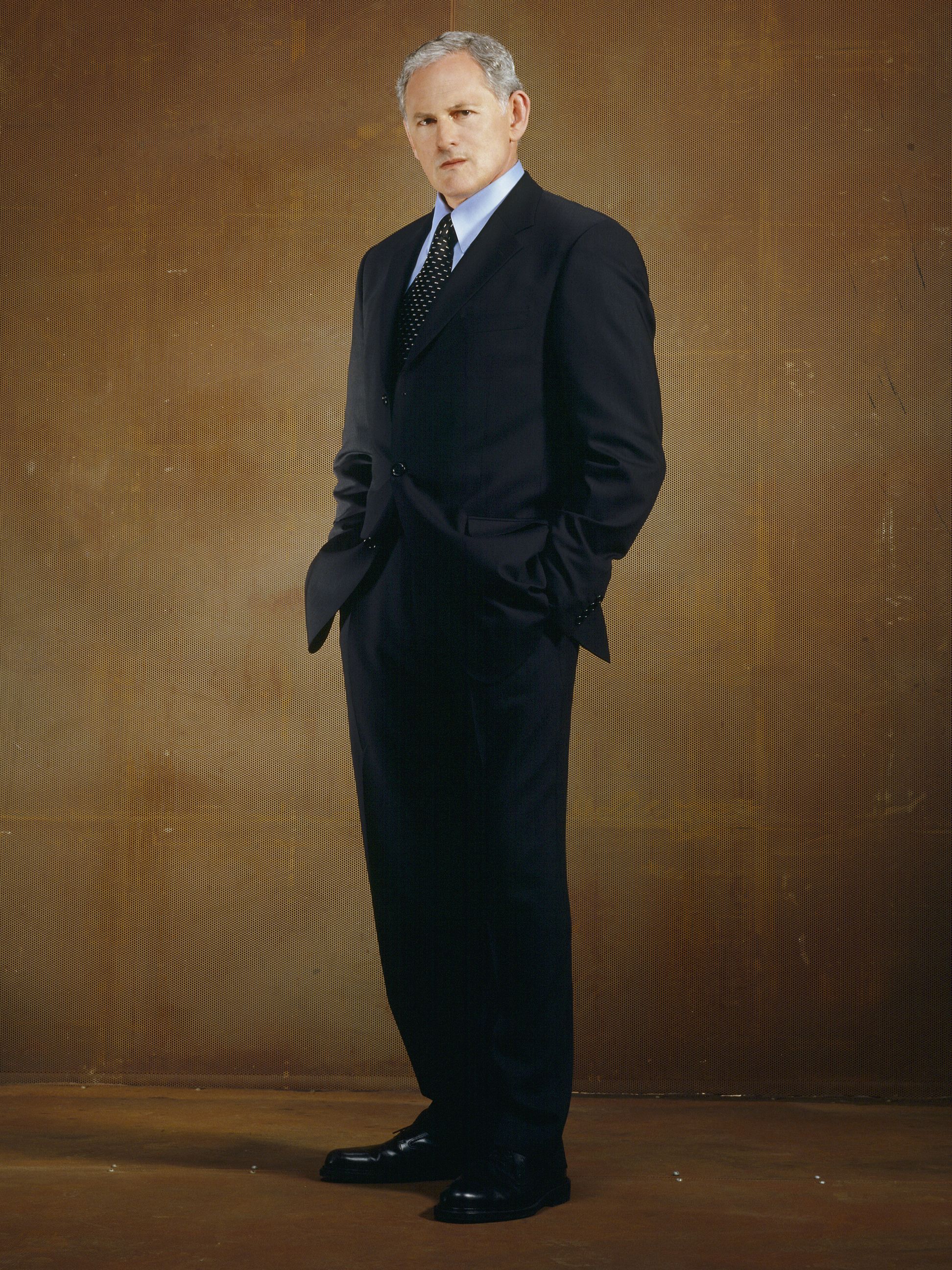 Description: A man in a suit and tie standing in a studio photo against a brown background with a brown wall.