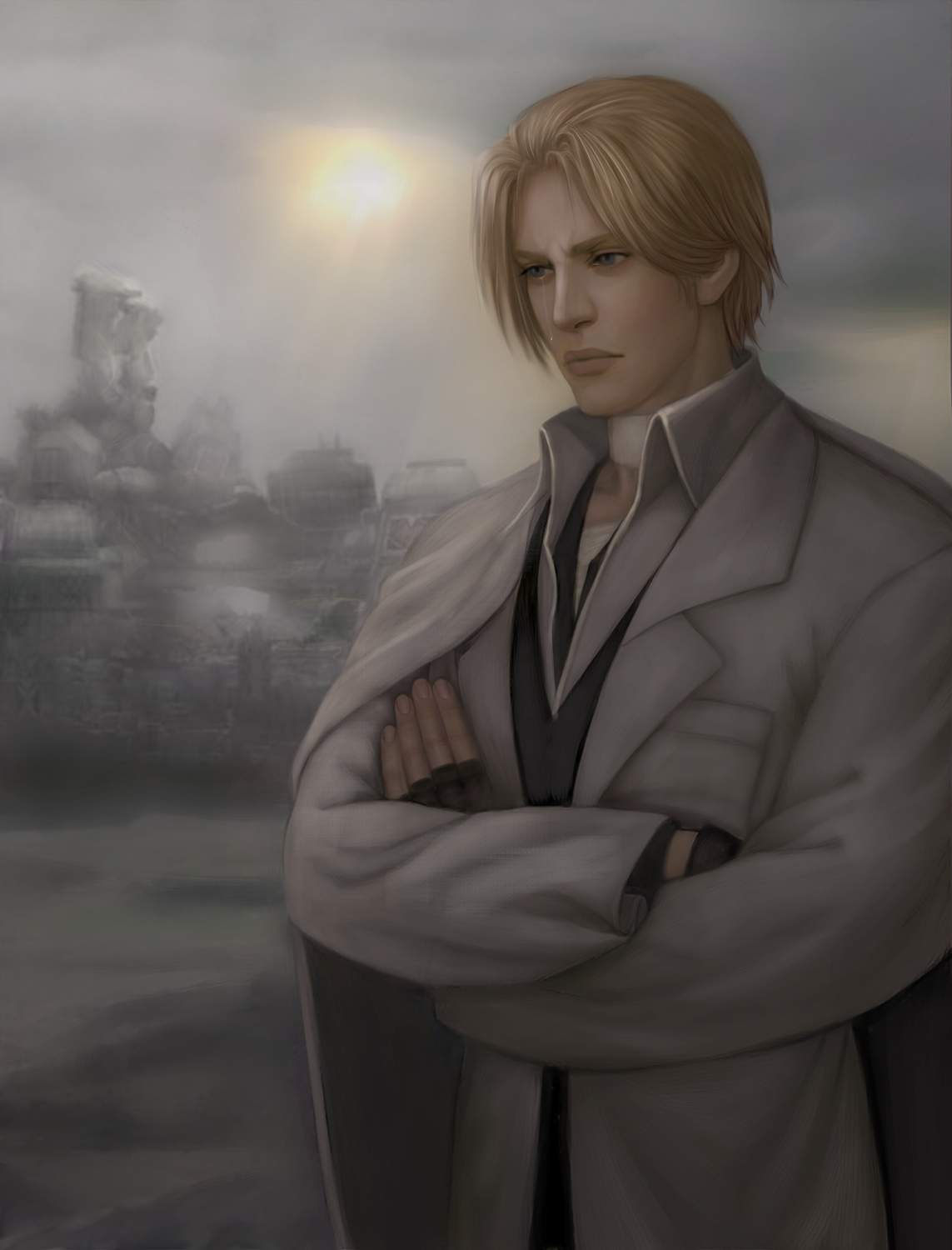 Description: A man in a suit and tie standing in front of a train engine with his arms crossed and his arms crossed.