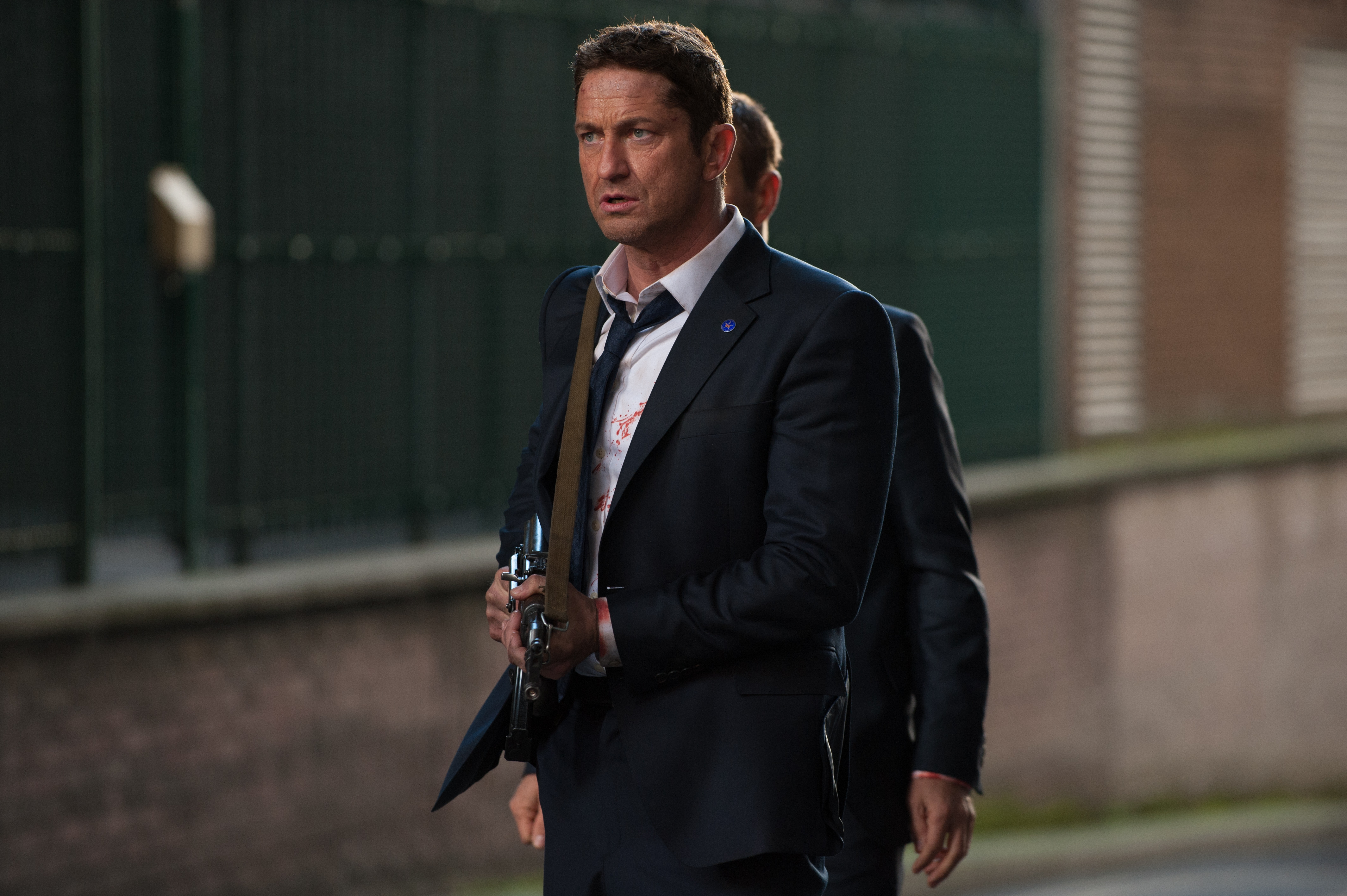 Description: A man in a suit and tie walking down the street with a camera in his hand and a woman in the background.