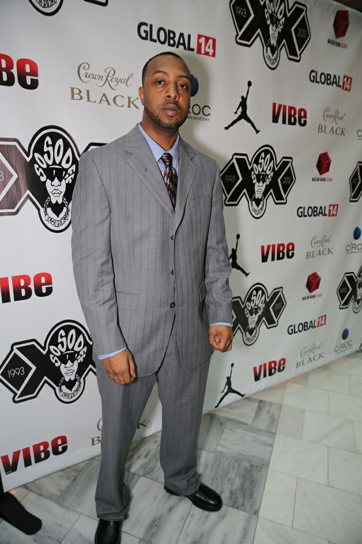 Description: A man in a suit and tie standing in front of a wall with a sign that says global black.