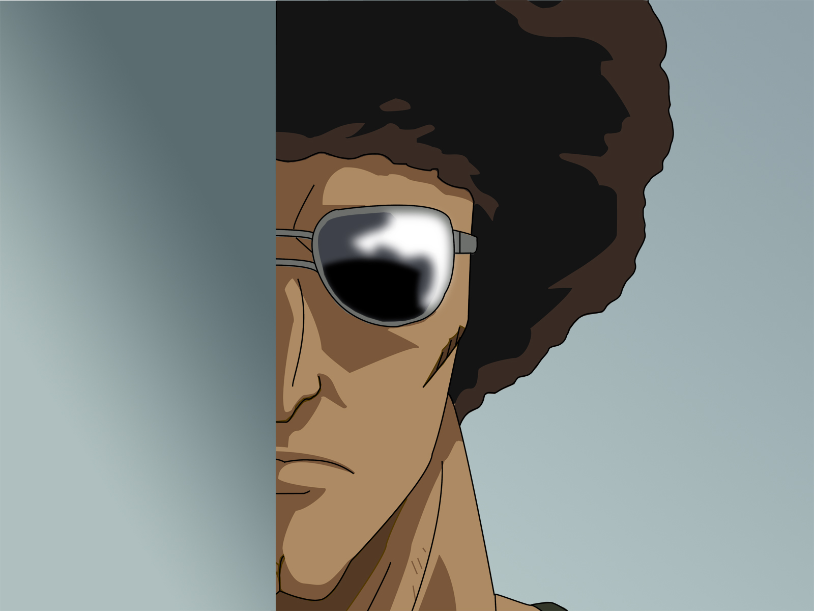 Description: A man with sunglasses and a afro haircut is looking out from behind a wall with a reflection of himself.