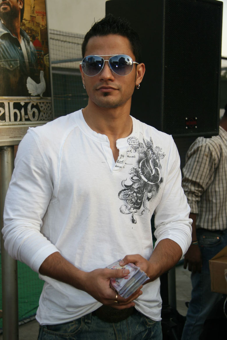 Description: A man in sunglasses holding a cell phone in his hand and standing next to a poster of a man.
