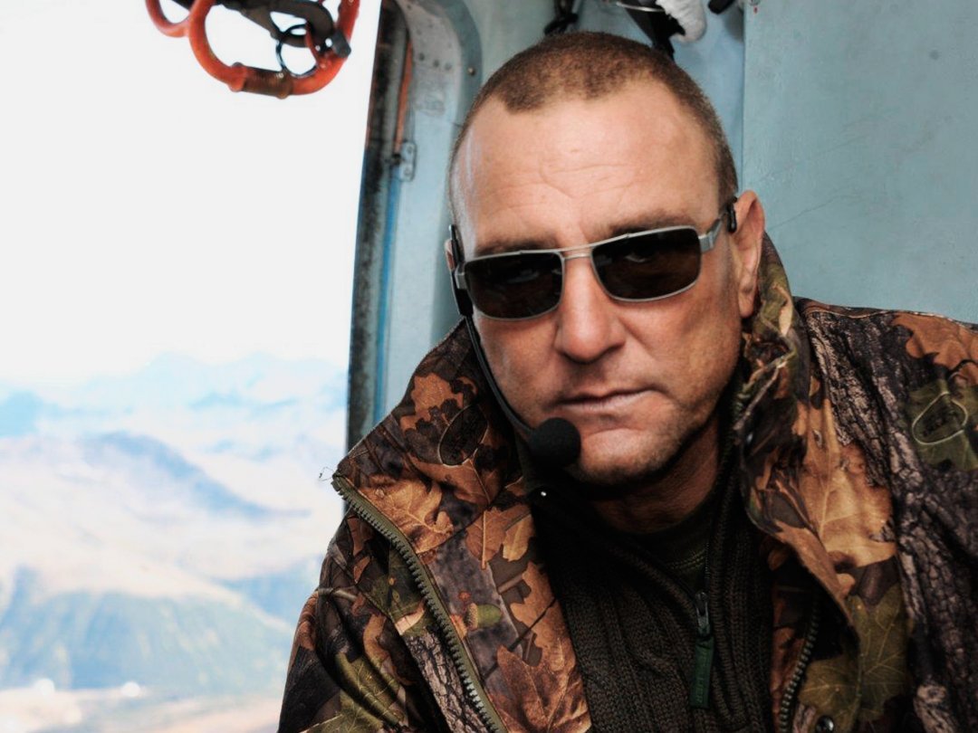 Description: A man wearing sunglasses and a jacket with a microphone in his hand and a mountain view in the background.
