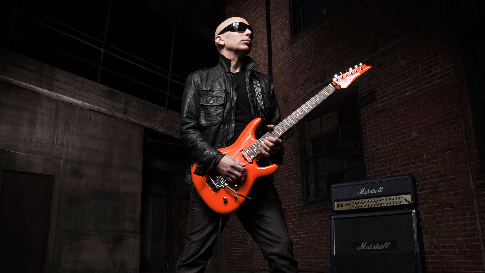Description: A man in sunglasses and a leather jacket holding a guitar in front of a brick wall and a guitar amplifier.