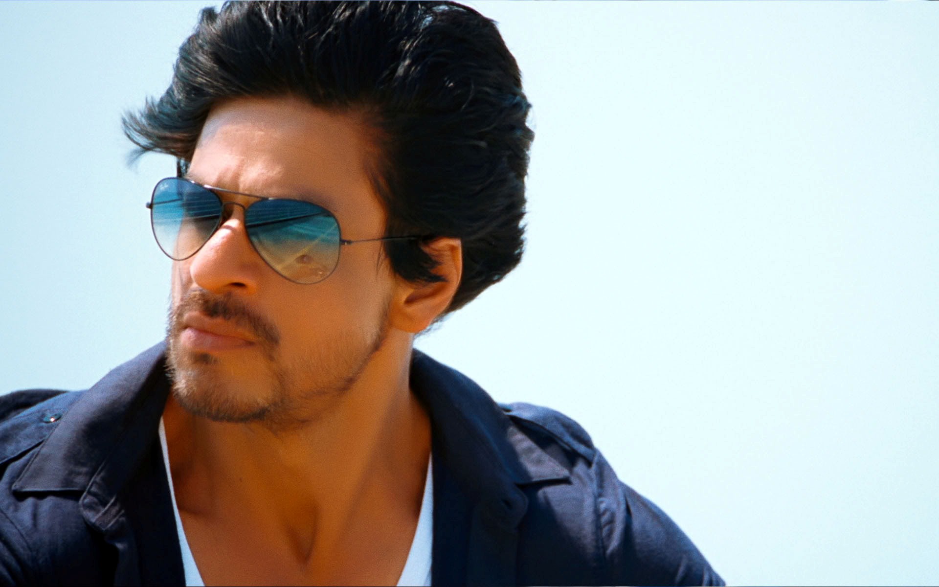 Description: A man with sunglasses on his face looking off to the side with a blue sky in the background and a blue sky in the background.