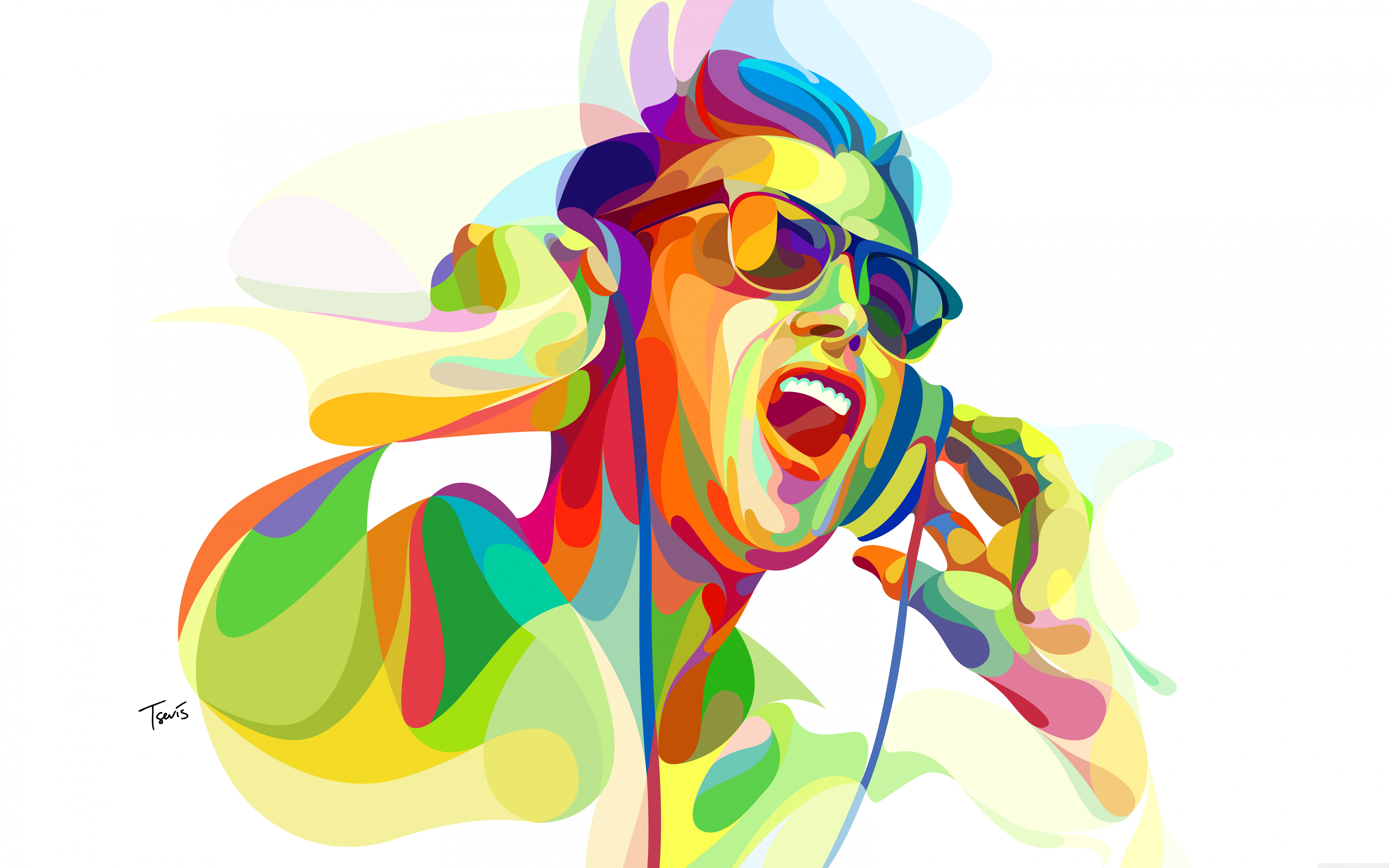 Description: A man with sunglasses and a microphone in his hand is painted in multi - colored colors and has his mouth open.