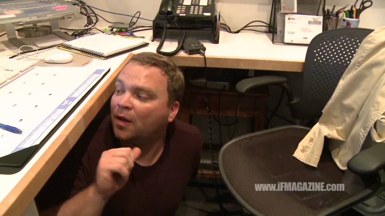 Description: A man sitting at a desk with a phone and a laptop computer on it.