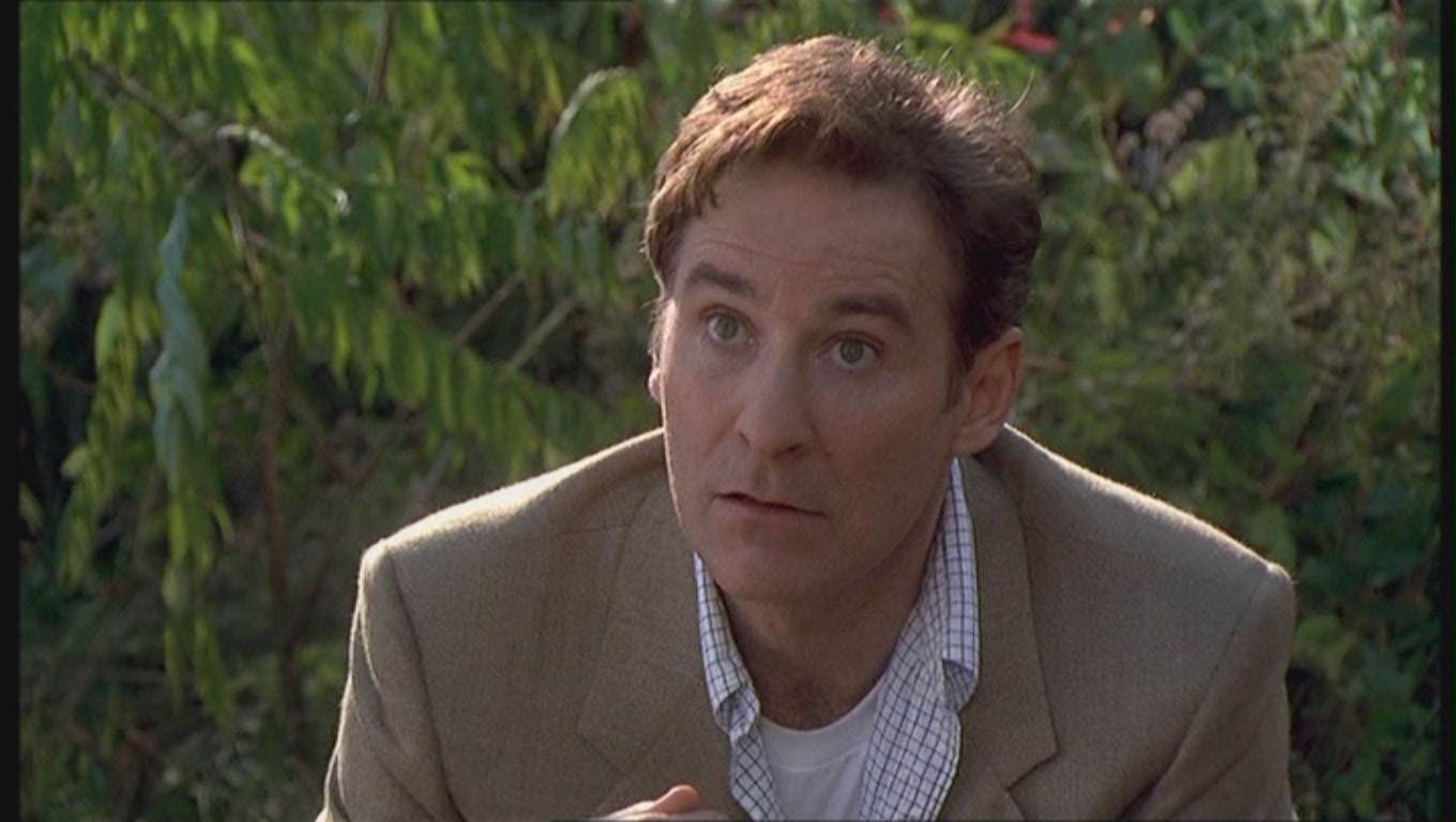 Description: A man in a suit looking surprised at something in the distance with a surprised look on his face and a bush in the background.