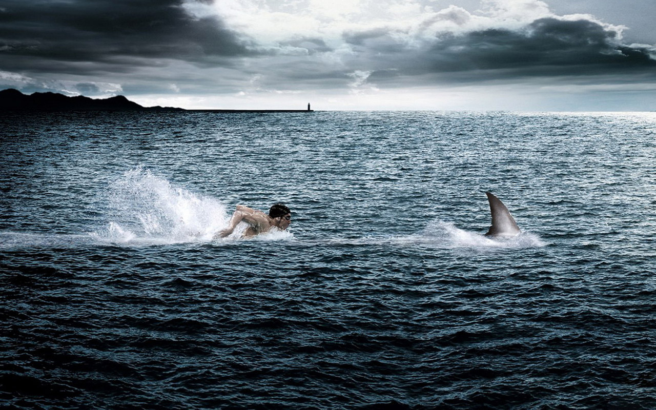 Description: A man swimming in the ocean with a shark in the water behind him and a boat in the distance.