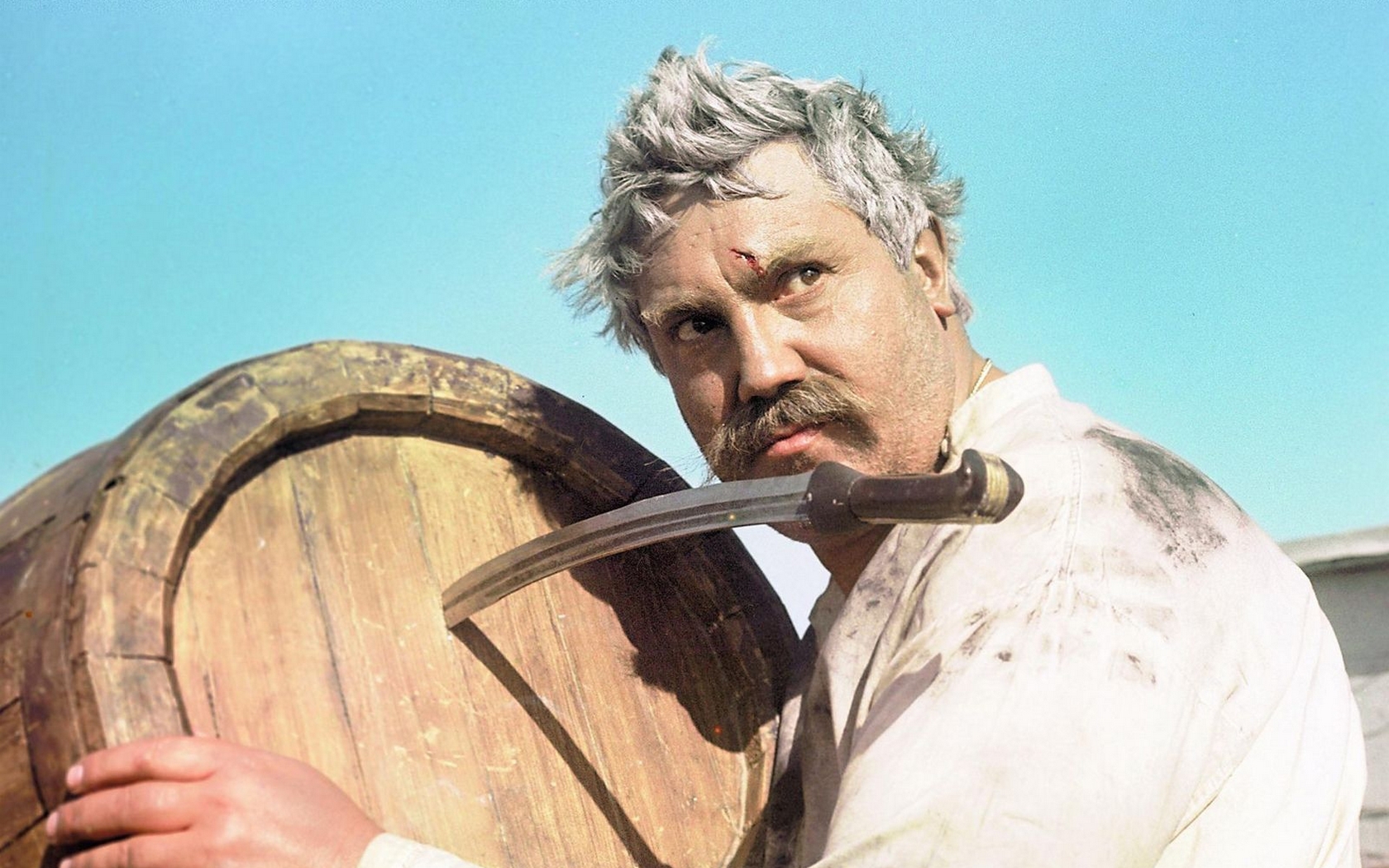 Description: A man holding a sword and a wooden barrel in his hands with a sky background behind him and a building in the background.